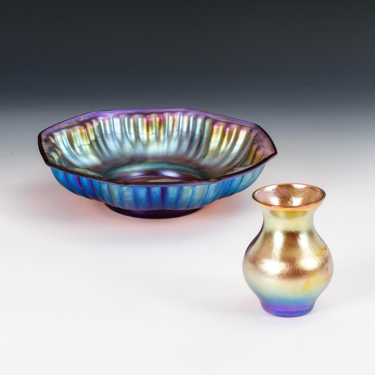 Kleine Birnvase (H 11 cm). / Oktogonale Schale mit gerade godroniertem Rand (Ø 24,5 cm). Je 1 kleine Randbestoßung an Schale und Vase.