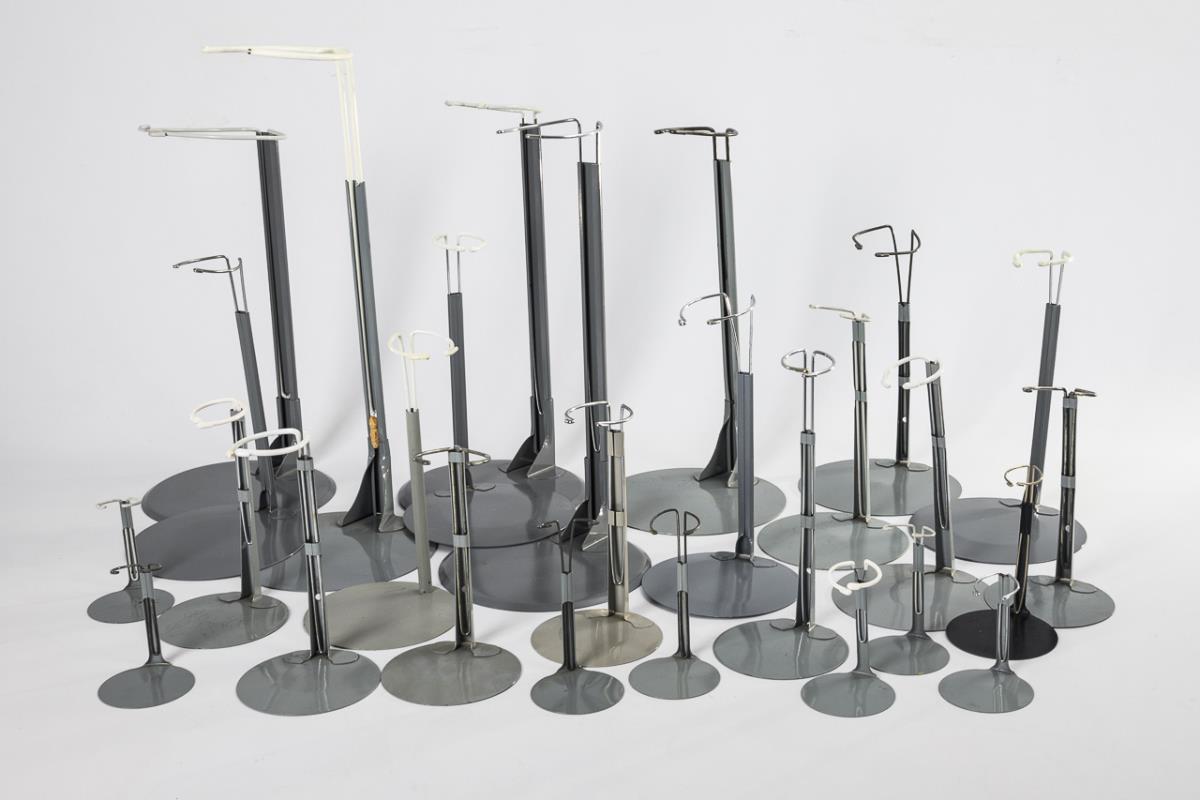 27 Puppenständer in Grautönen mit runden Füßen aus Metall, verschiedene Größen. 1x mit Kork fixiert.
