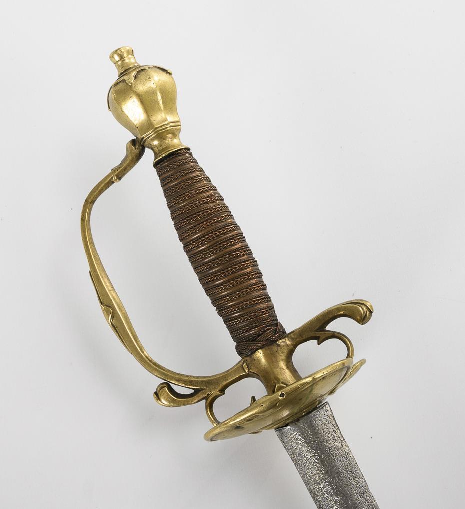 Gerade, zweischneidige Klinge mit gleichmäßigen Korrosionsnarben. Messinggefäß mit kleinem Stichblatt und angedeuteten Fingergriffen. Griff mit Draht- und Bandwicklung.