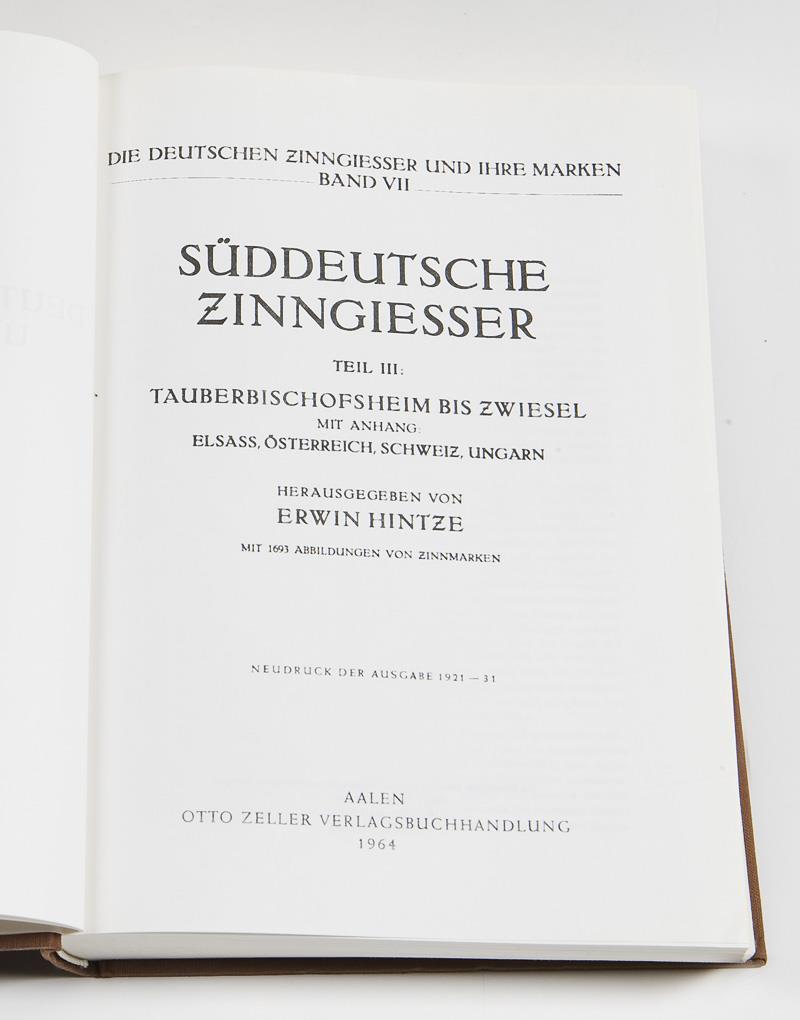 Band I: Sächsische Zinngiesser, 1531 Abbildungen, 345 Seiten. Band II: Nürnberger Zinngiesser, 341 Abbildungen, 175 Seiten. Band III: Norddeutsche Zinngiesser, 1652 Abbildungen, 544 Seiten. Band IV: Schlesische Zinngiesser, 1164 Abbildungen, 452 Seiten. Band V: Süddeutsche Zinngiesser, 803 Abbildungen, 339 Seiten. Band VI: Süddeutsche Zinngießer, 786 Abbildungen, 320 Seiten. Band VII: Süddeutsche Zinngiesser mit Anhang Elsass, Österreich, Schweiz, Ungarn, 1693 Abbildungen, 507 Seiten. Leinen mit Goldprägung. Rücken verblasst, insgesamt guter Zustand.