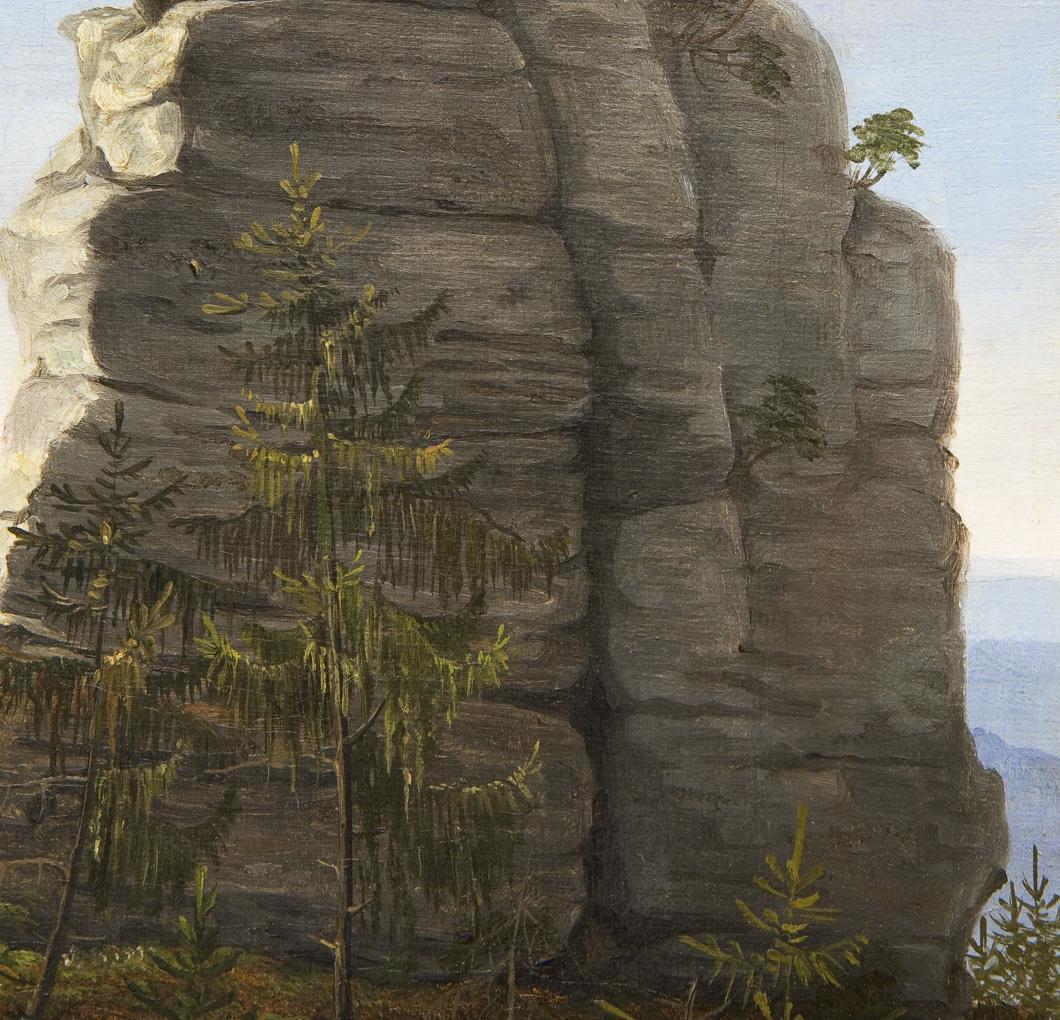 Das Prebischtor ist die größte natürliche Sandstein-Felsbrücke Europas, ein herausragendes Naturdenkmal des Elbsandstein-Gebirges, es liegt nahe der deutsch-tschechischen Grenze. Ein kleinformatiges, fein gemaltes beeindruckendes Motiv mit räumlicher Tiefe in stiller Beschaulichkeit. Die Landschaft spiegelt das Lebensgefühl der Romantik, die beiden kleinen Rückenfiguren halten Zwiesprache mit der Natur. Profilierter Goldrahmen mit Ornamentleiste.