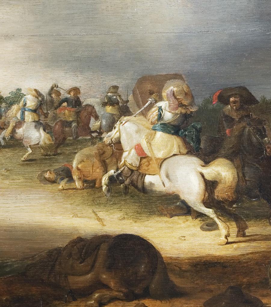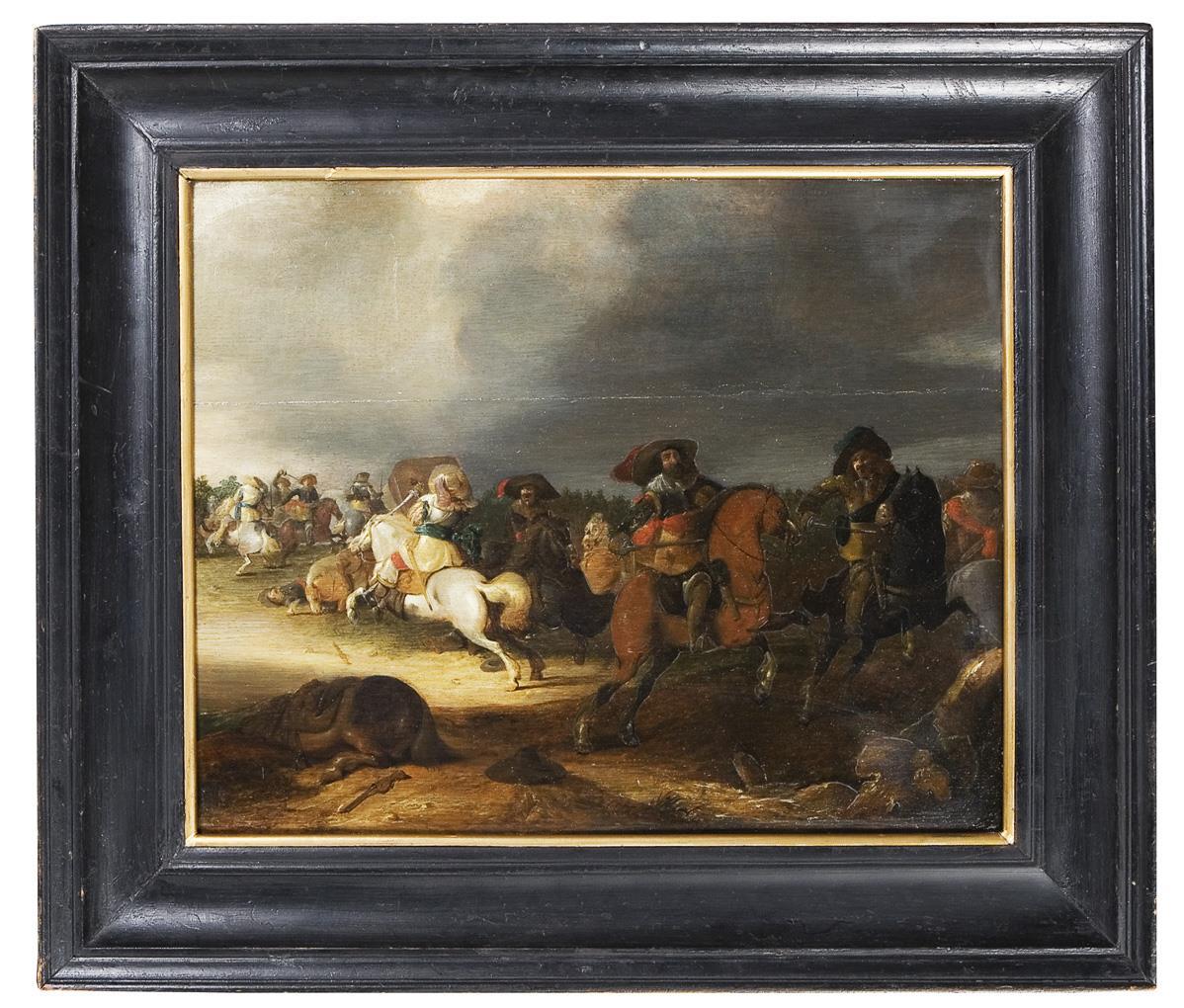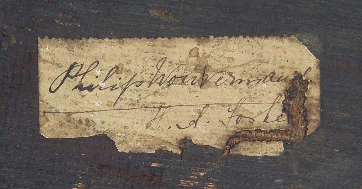 Rückseitig alter Klebezettel: Philips Wouwerman, undeutlicher Namenszug. Geschwärzter Profilrahmen. Ehemals horizontaler Riss rückseitig mit Schwalbenschwanzverbindung alt restauriert.