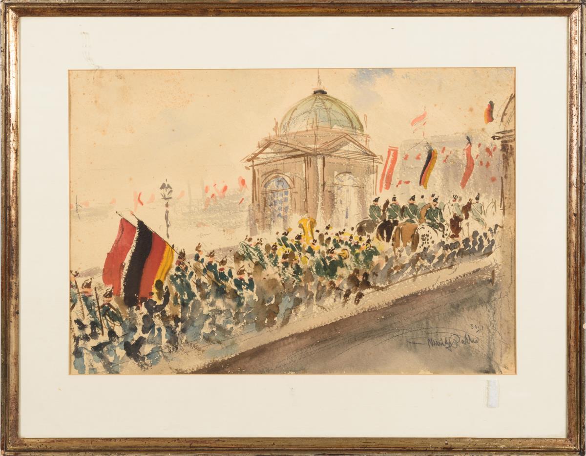 Das Musikkorps mit Fahnen folgt der Kavallerie auf ansteigender Brücke vor klassizistischem Gebäude. Wenige Altersspuren.