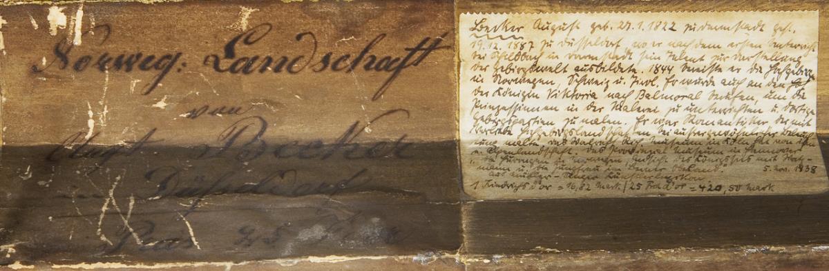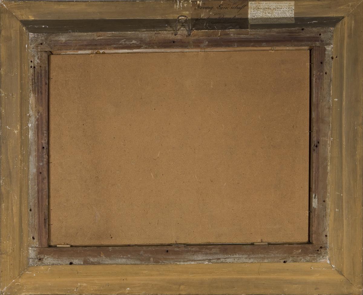 Rückseitig auf alten Klebezetteln bezeichnet. Originaler breiter vergoldeter Stuckrahmen. Rahmen leicht defekt.
