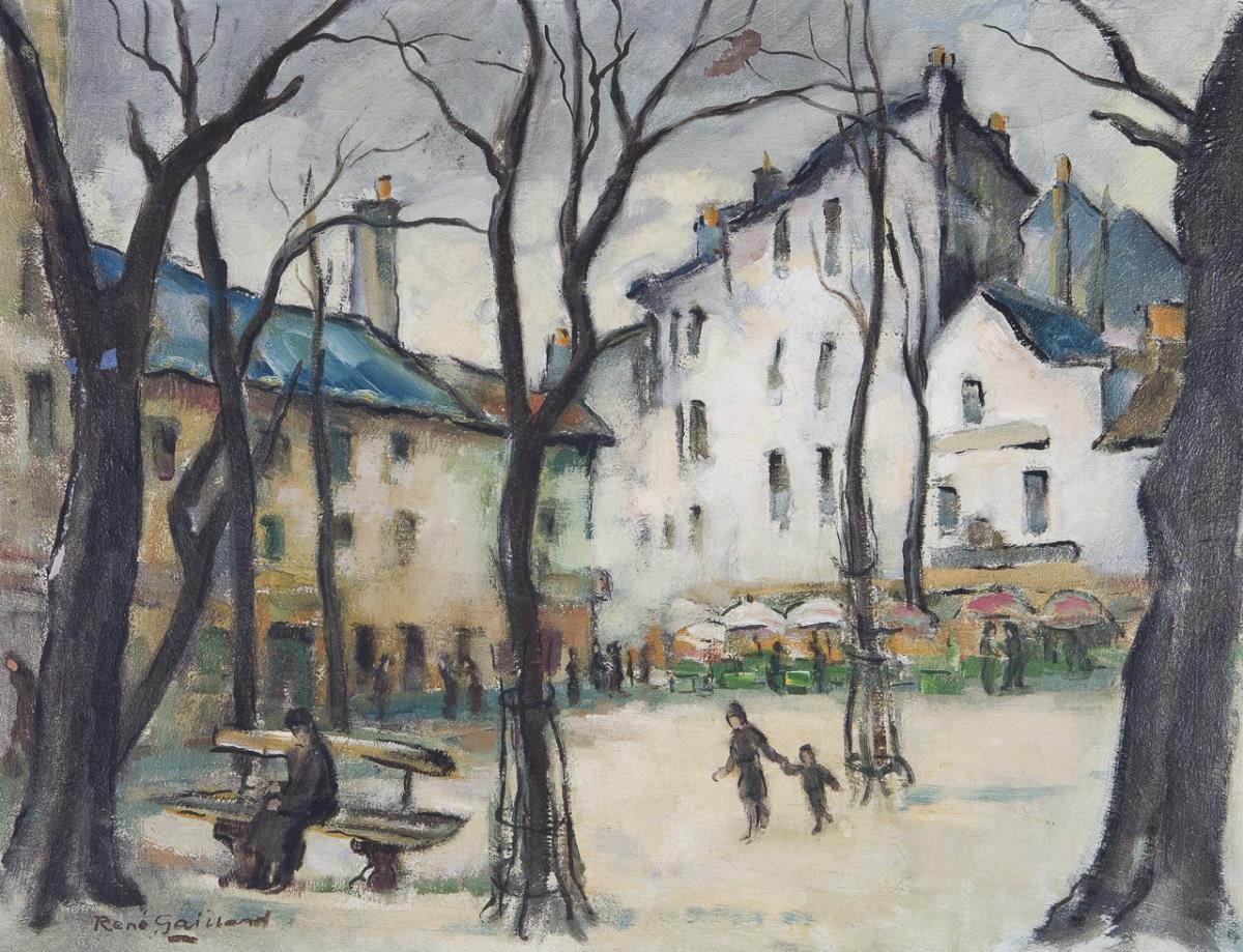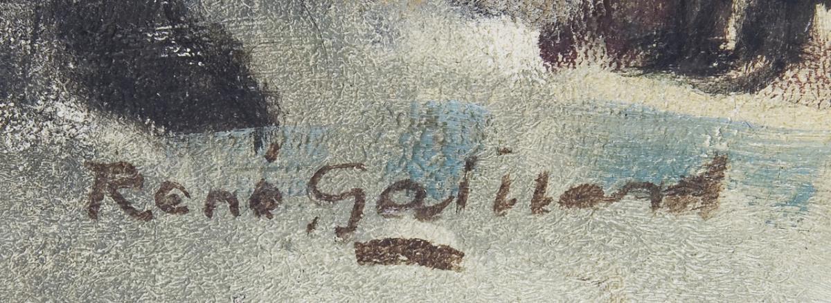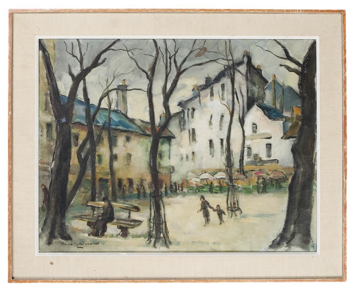Stimmungsvolle Ansicht mit Figurenstaffage eines Künstlers der Postmoderne. Signiert: René Gaillard. Schlichter Rahmen mit Leinenbezug.