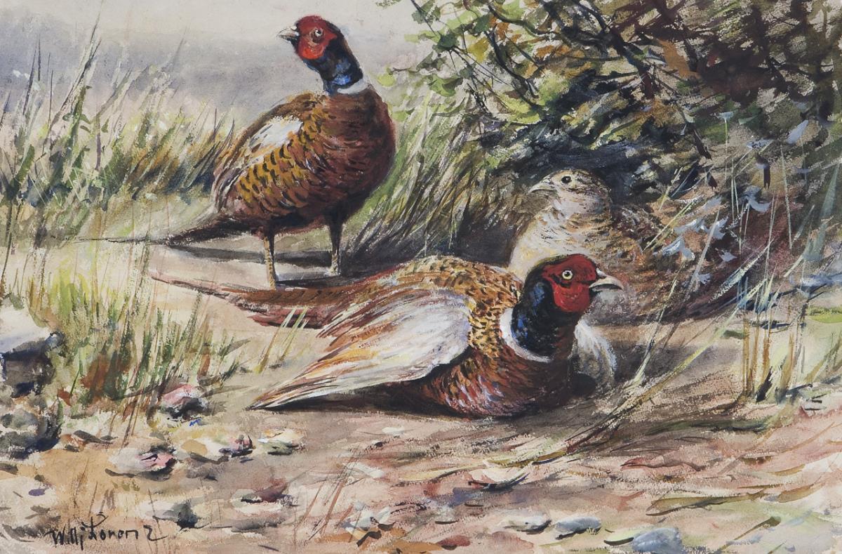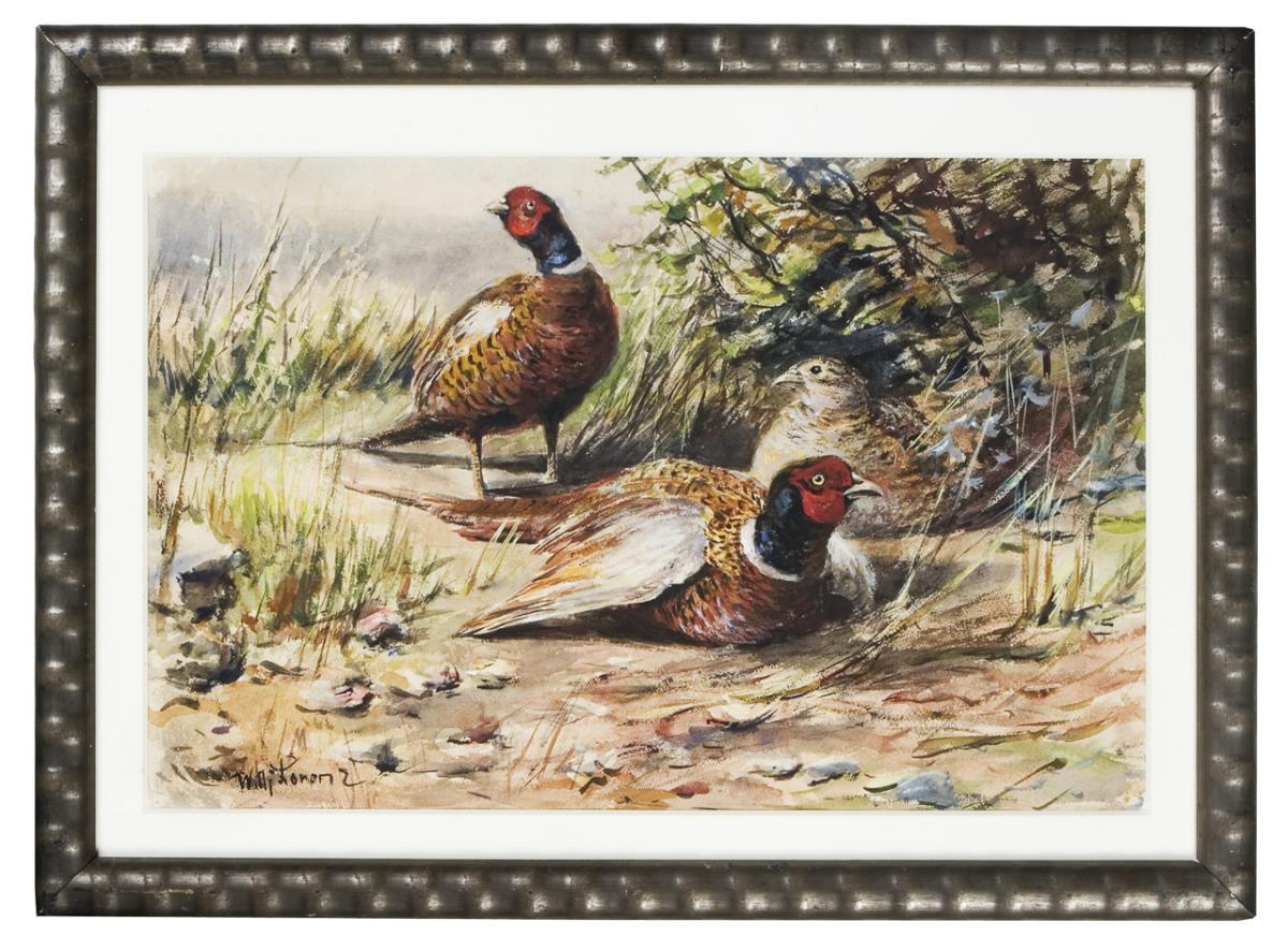 Zwei farbenprächtige Fasanenhähne und eine brütende Fasanenhenne in bräunlicher Tarnfärbung. Passepartout, verglaster Rahmen.