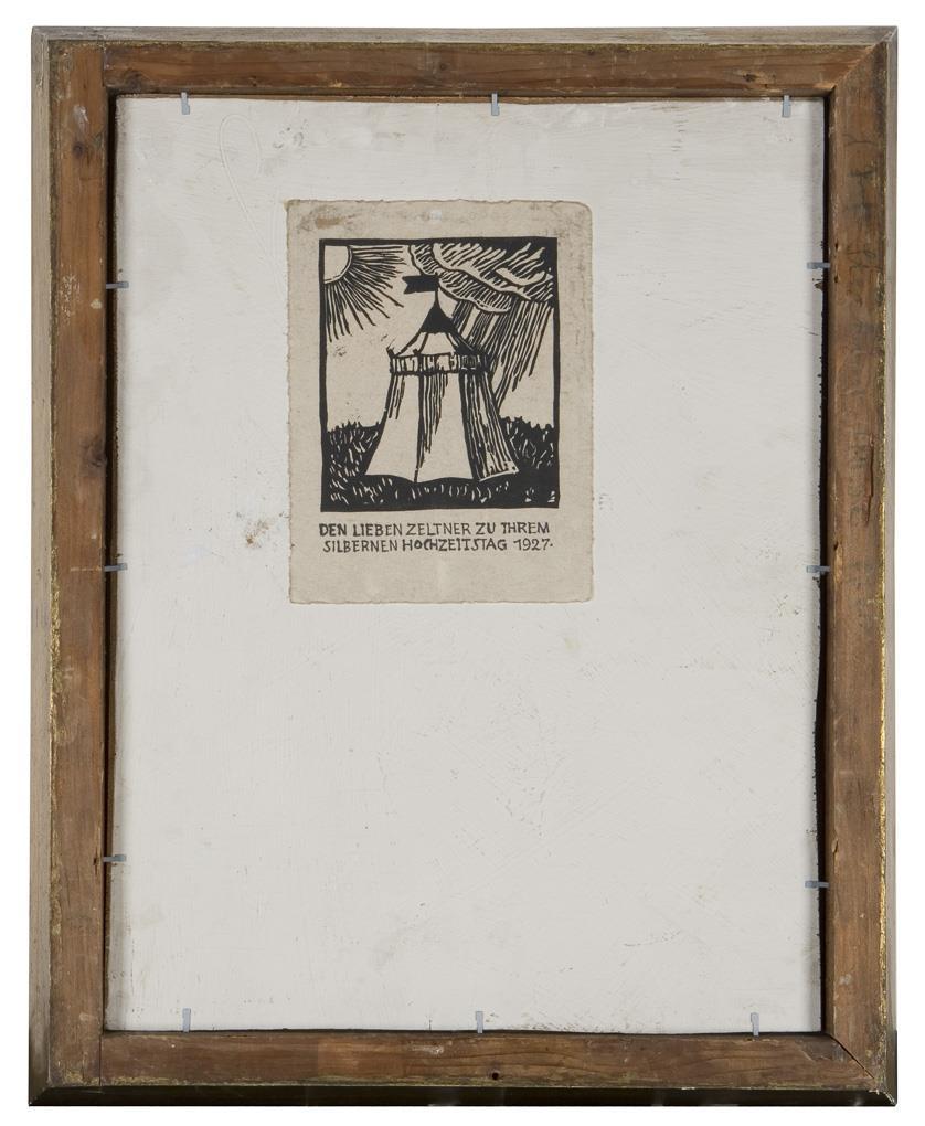 Rückseitig Holzschnitt mit Widmung. Profilierter Goldrahmen.
