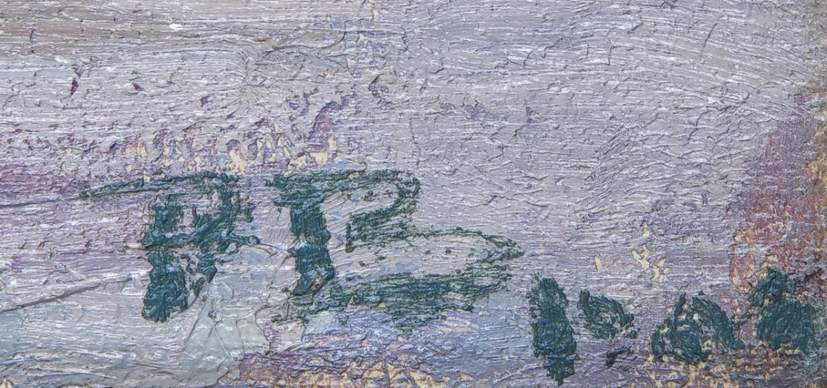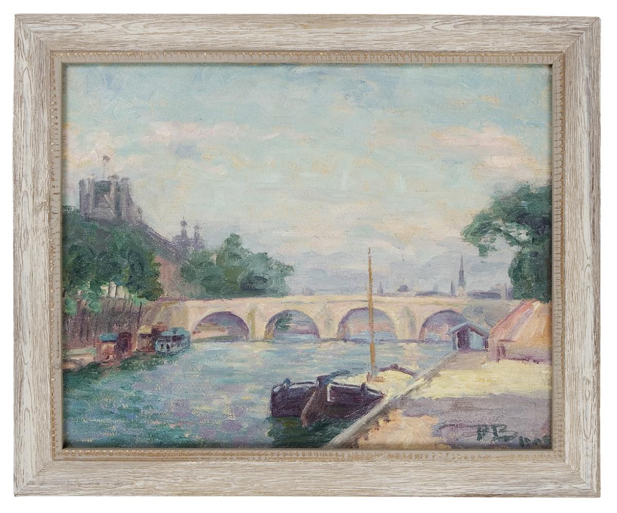 Impressionistisch angelegte Ansicht mit Blick auf Notre-Dame in hellem Kolorit. Undeutlich monogrammiert, datiert. Rückseitig Pariser Stempel. Neuwertiger Rahmen. Eine kleine Ecke im Himmel restauriert.