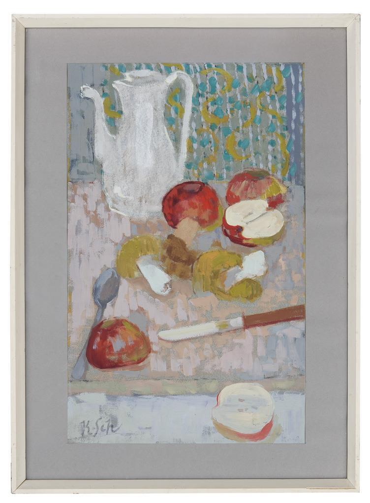 Arrangement in einem fein abgestuften hellen Kolorit, in dem die reine glühende Grundfarbe der Äpfel eingebettet ist. Passepartout, schlichter verglaster Rahmen, weiß gefasst. Rahmen partiell defekt.