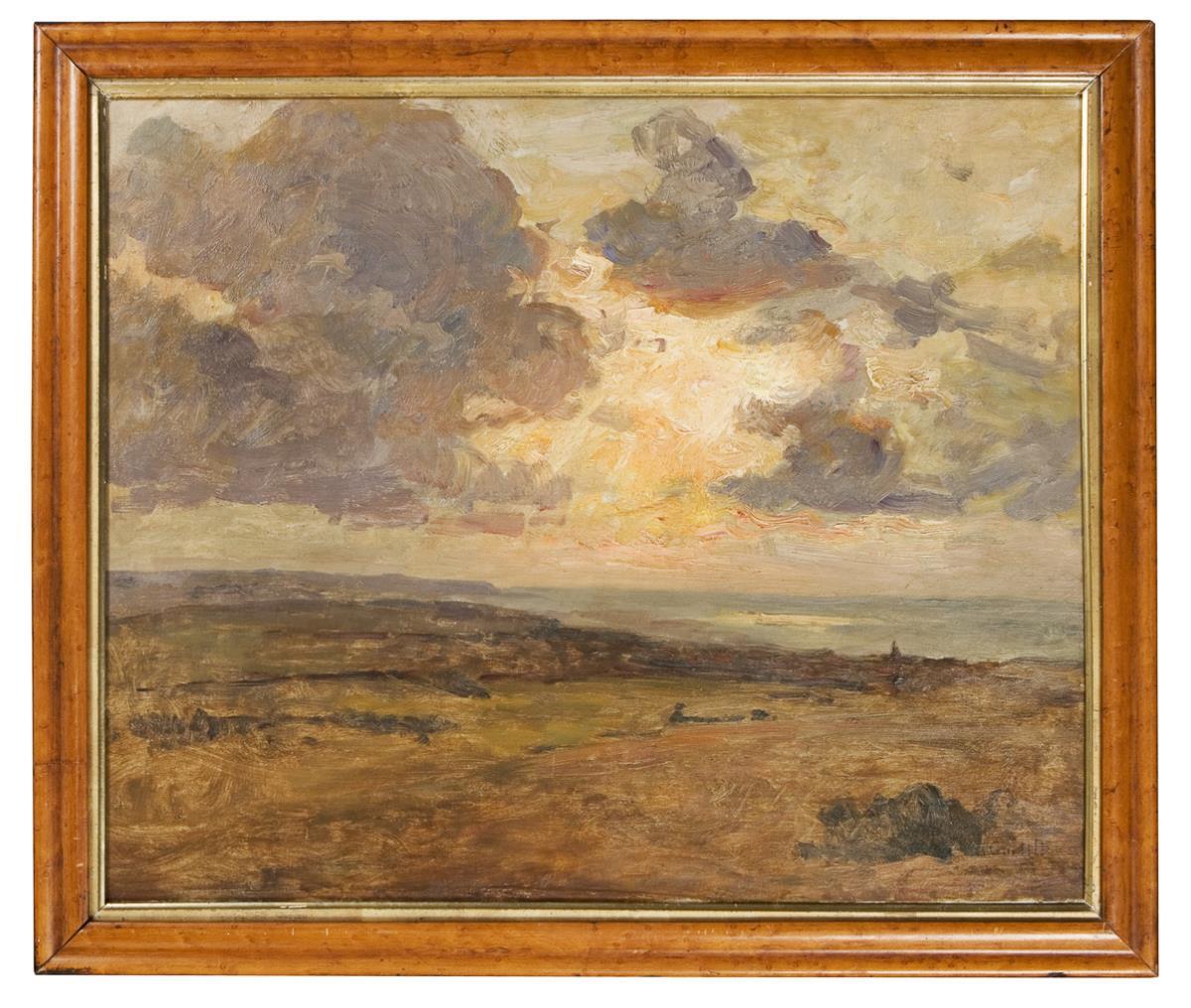 Stimmungsvoller Landschaftsausschnitt mit besonderer Atmosphäre. Profilierter Rahmen mit Waschgoldleiste.