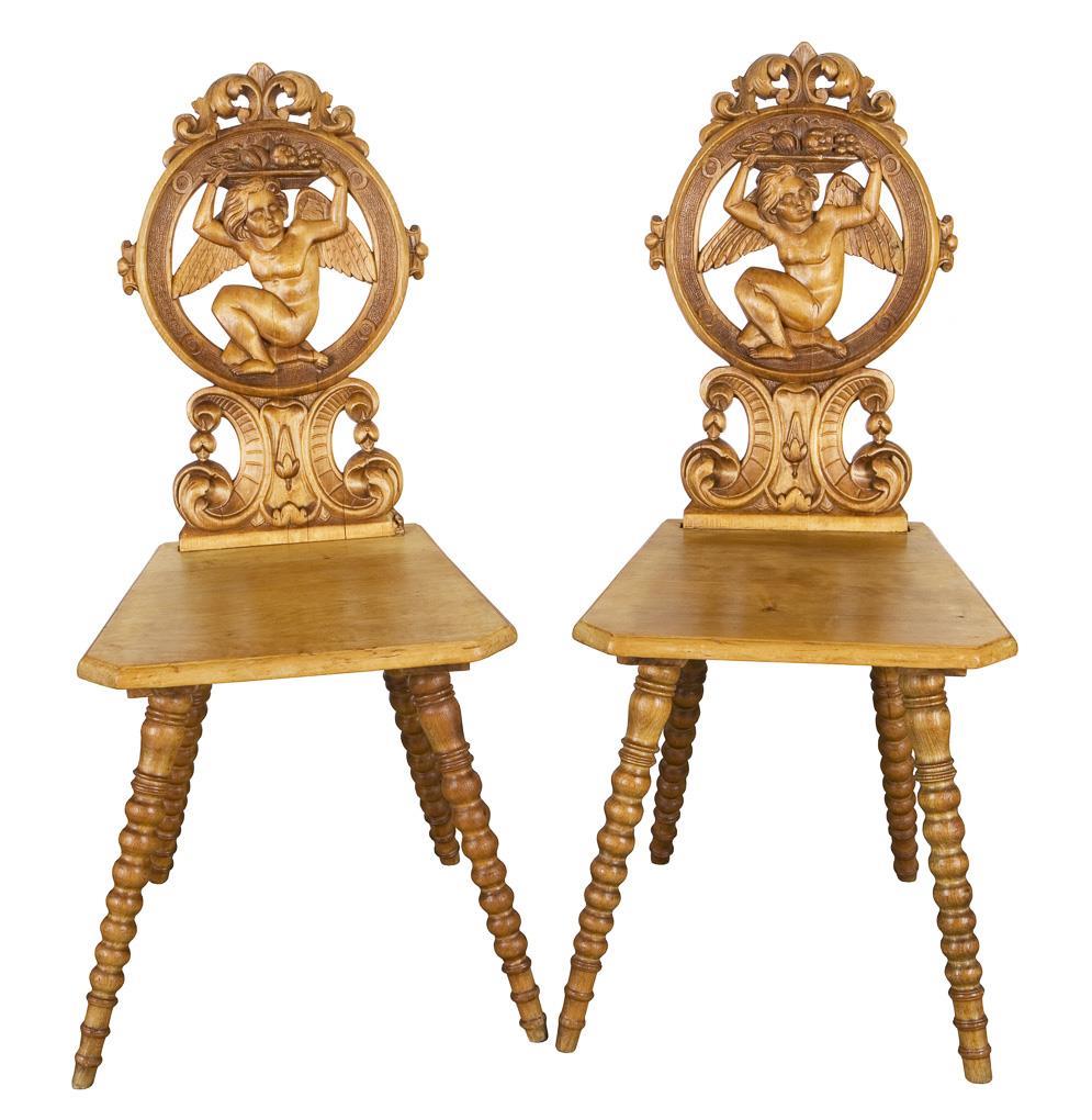 Durchbrochen gearbeitete, reich geschnitzte Lehne mit floralem, figürlichem und ornamentalem Dekor. In runden Kartuschen Amoretten mit ausgebreiteten Flügeln und Fruchtkorb. Trapezförmiger Sitz über vier ausgestellten, gedrehten Beinen.