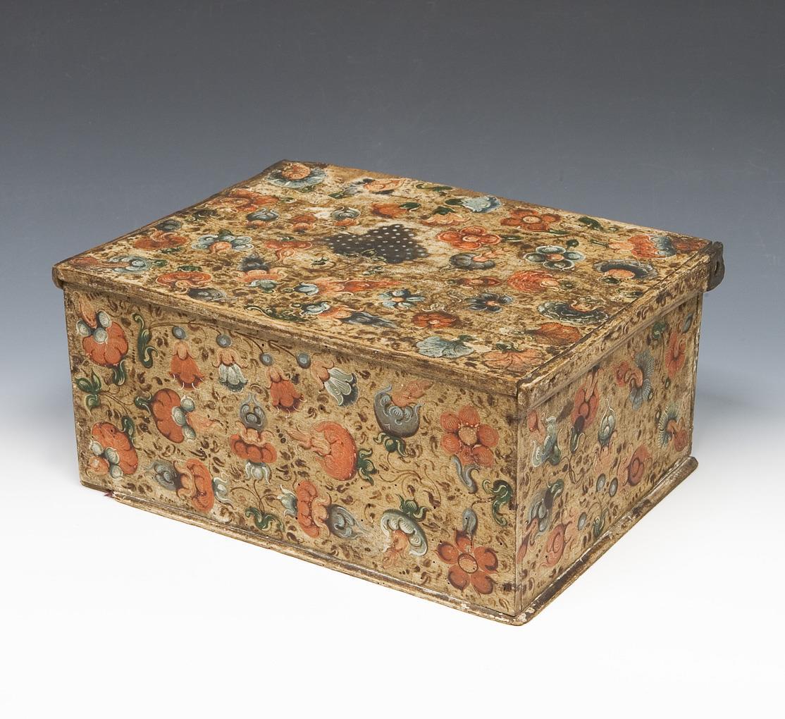 Allseits farbige florale Bemalung, auf dem Deckel zentral eine Weintraube. Rechteckiger Korpus mit Scharnierdeckel. Anobienbefall, eine kleine Leistenecke fehlt.