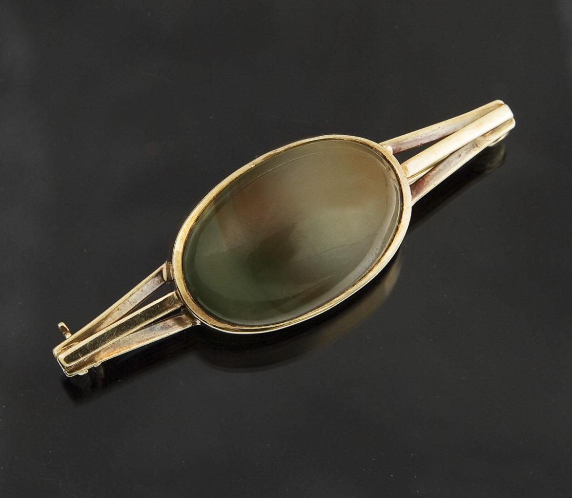 Ovaler Achatvarietät-Cabochon in Zargenfassung circa 19,5 x 13 mm. Punzen: Feingehalt, Juweliermarke in Raute, Schriftzug HANDARBEIT.
