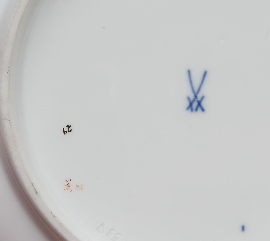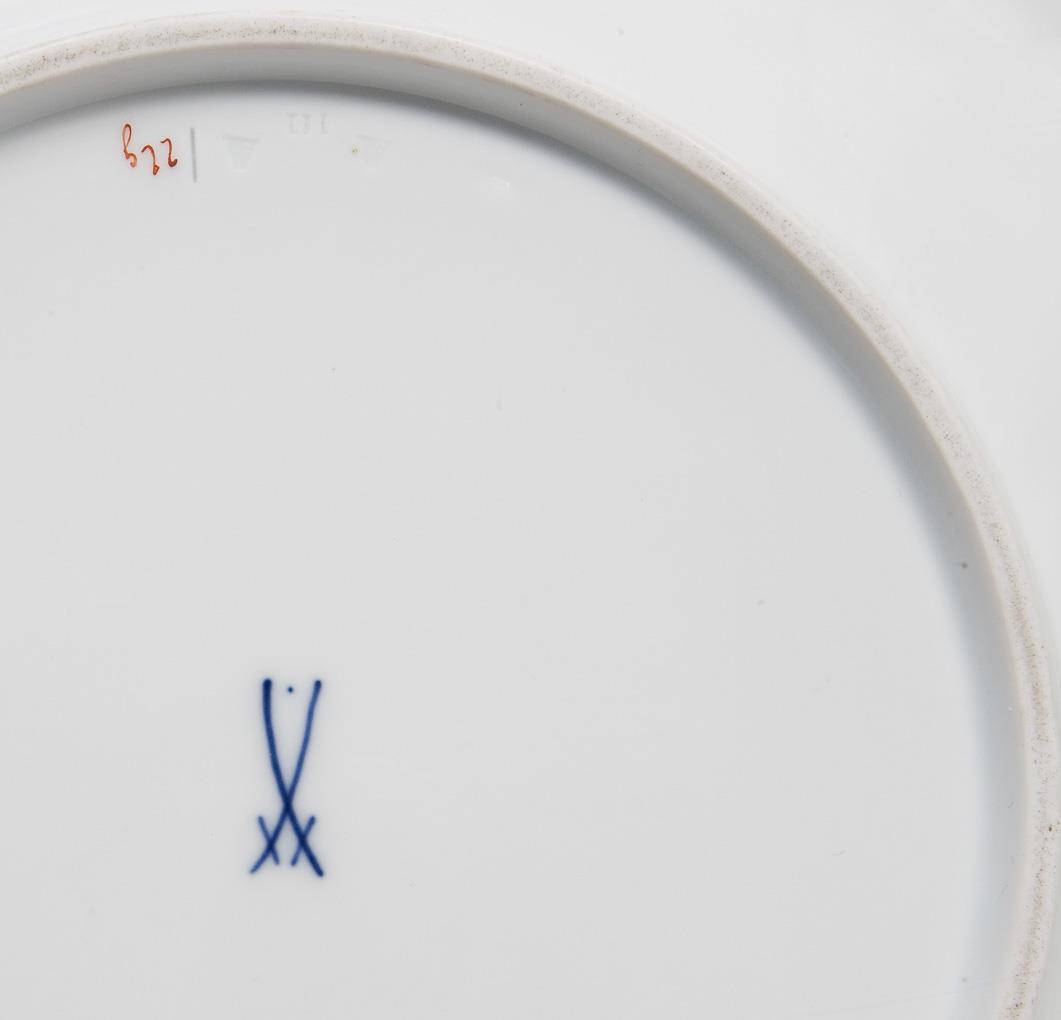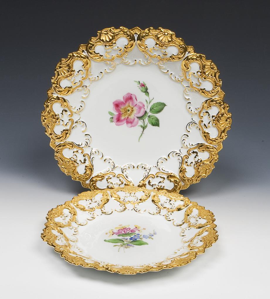 Modell von Ernst August Leuteritz und Mitarbeiter 1851-1853. Reliefiert, gold staffiert, mattiert und poliert, farbige florale Bemalung. Pressmarken, Malermarken, Schwertermarken, eine Schertermarke mit Punkt, die kleine Schale zweimal gestrichen.