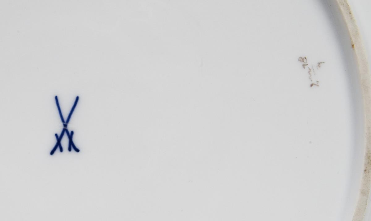 Partiell dunkelgrüner Fond, farbige Bemalung mit Einzelblüten, Goldstaffage. "B-Form". Pressmarken, Malermarken, Schwertermarken zweimal gestrichen. Fond partiell berieben.