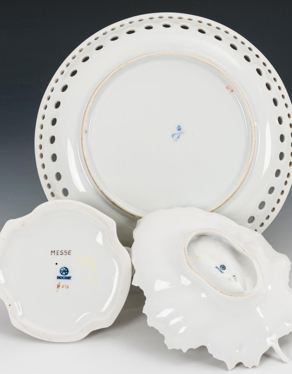 2x Höchst: Blattschale (L 16,5 cm) und Handleuchter (H 8 cm) mit Blumenmalerei. / 1x Fürstenberg: Durchbruchschale mit Watteaumalerei (Ø 21,5 cm).