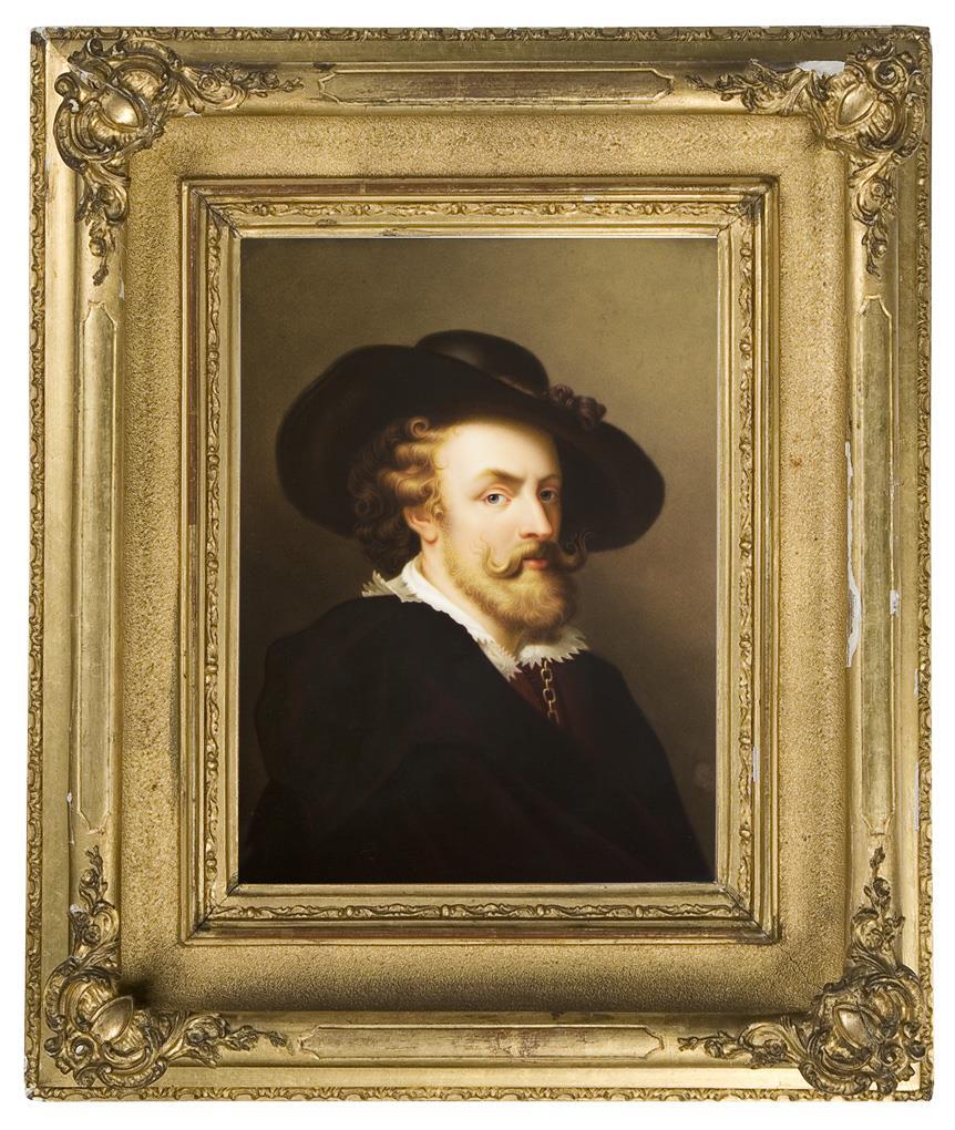 Selbstbildnis mit Hut und Goldkette von 1623. Das Original (signiert, datiert und beschriftet, 86 x 62 cm) in der Royal Collection Trust (Kunstsammlung der britischen Königsfamilie, Buckingham Palace, London). Feine farbige Bemalung, unsigniert, unglasierter Boden, Pressmarke Zepter über KPM. Originaler vergoldeter Stuckrahmen mit Holz-Rückwand. Rahmen partiell defekt.