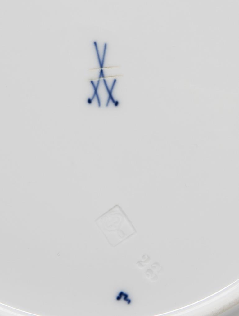 Modell-Jahr: 1903. Reliefdekor "Peitschenhieb", kobaltblaue Unterglasurbemalung. Pressmarken, Malermarken, Künstler-Signet, Schwertermarken zweimal gestrichen, ein Teller um 1935.