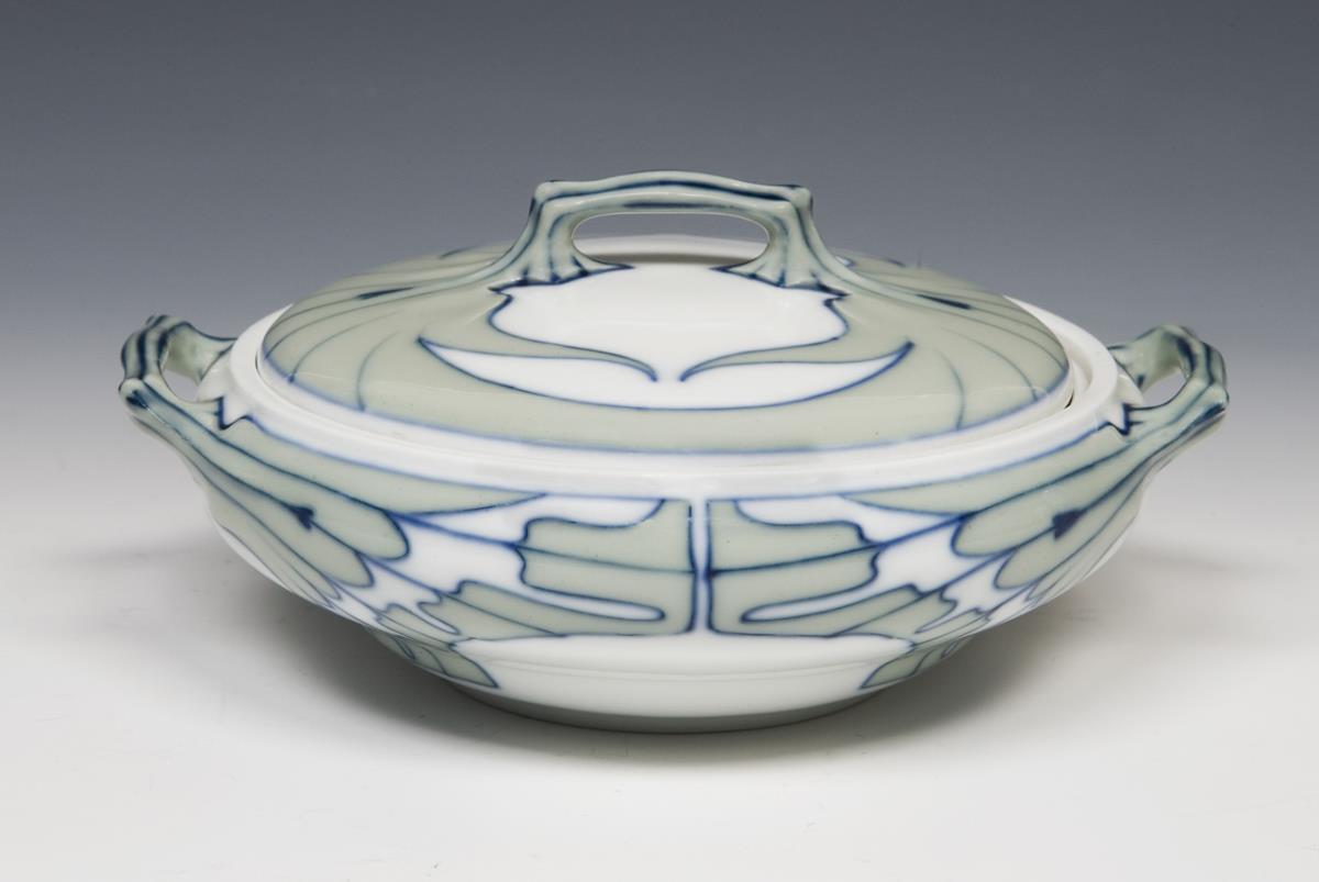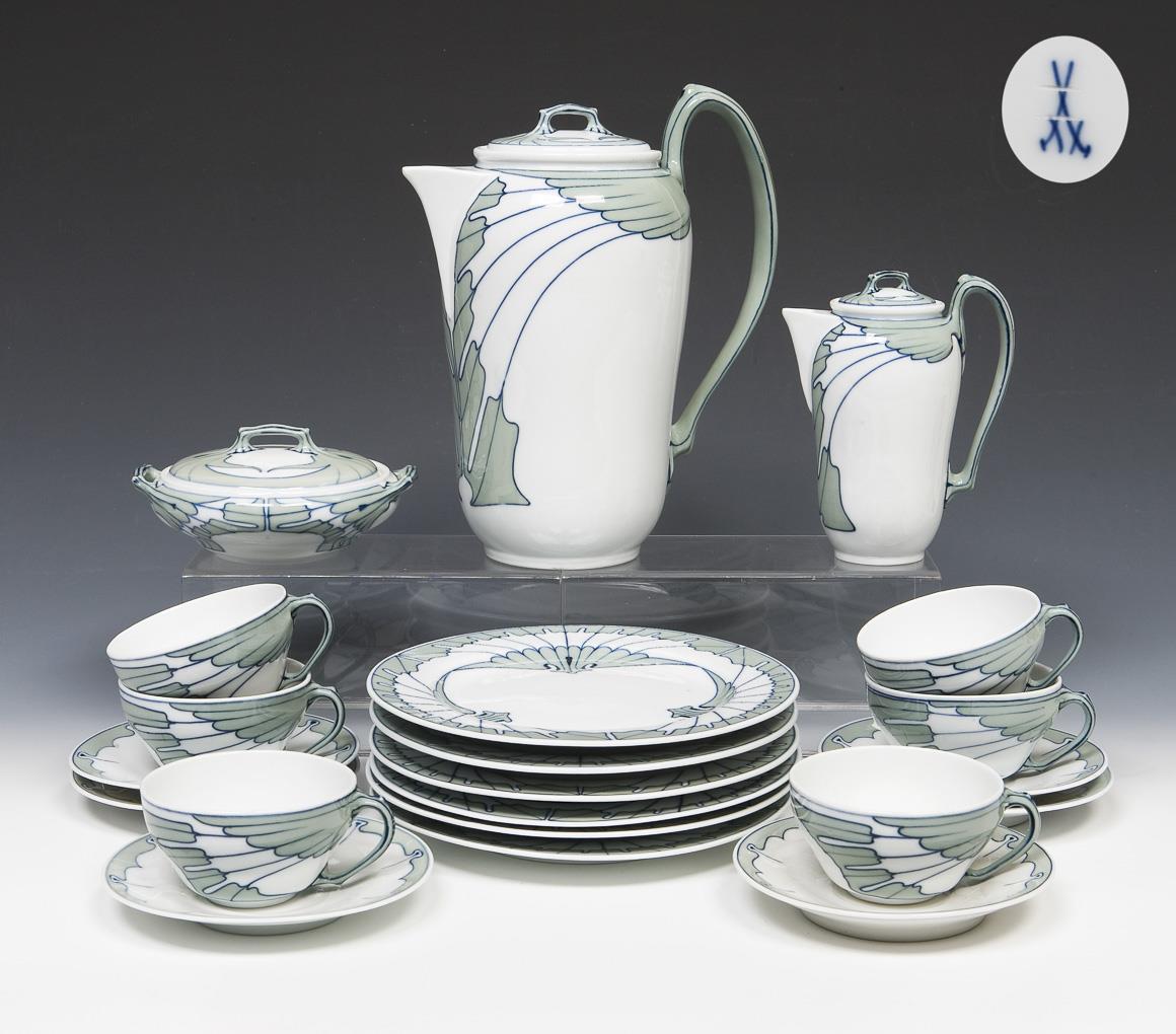Modell-Jahr: 1901. 21 Teile: Kaffeekanne, Milchkännchen, Zuckerdose, 6er Satz Tassen, 6er Satz Untertassen, 6er Satz Dessertteller. Seladongrüne und kobaltblaue Unterglasurbemalung, "Flügelmuster", Form "T glatt". Pressmarken, Malermarken, Schwertermarken zweimal gestrichen.
