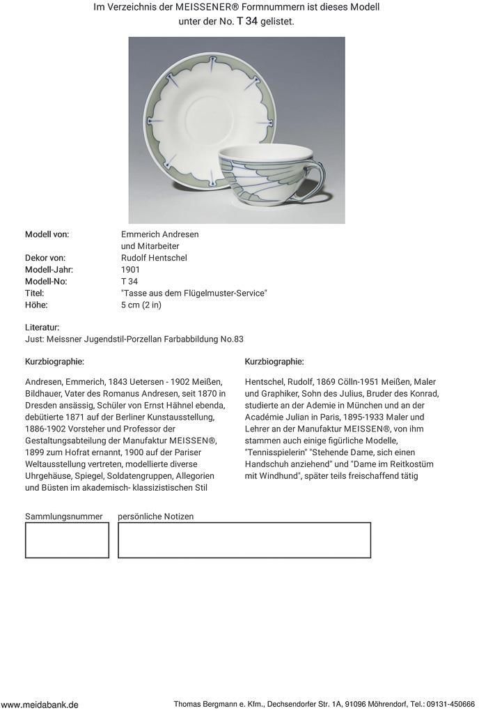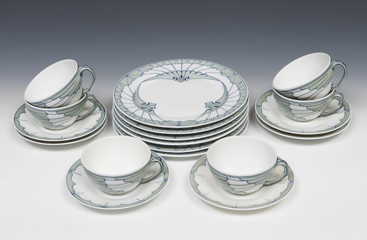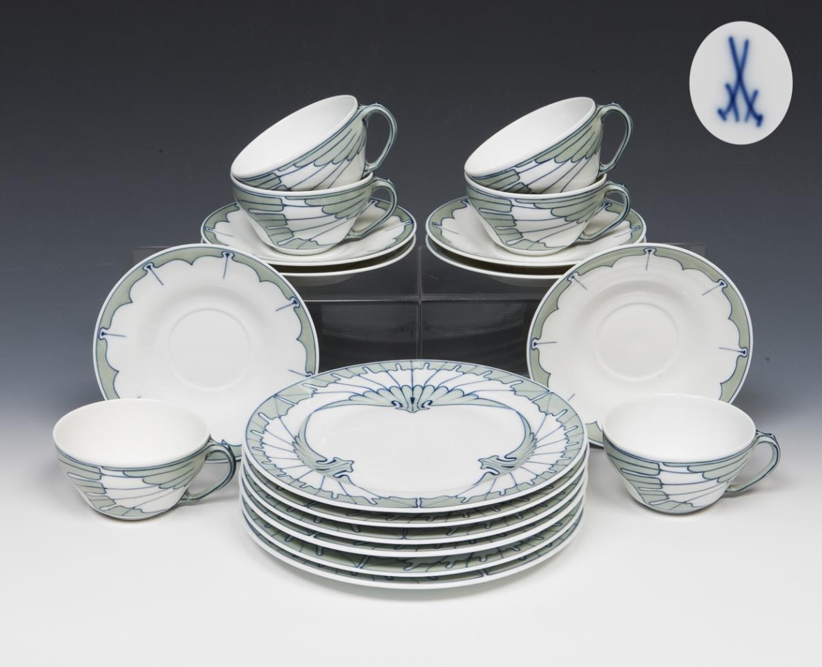 Modell-Jahr: 1901. 18 Teile: 6er Satz Tassen, 6er Satz Untertassen, 6er Satz Dessertteller. Seladongrüne und kobaltblaue Unterglasurbemalung, "Flügelmuster", Form "T glatt". Pressmarken, Malermarken, Schwertermarken.
