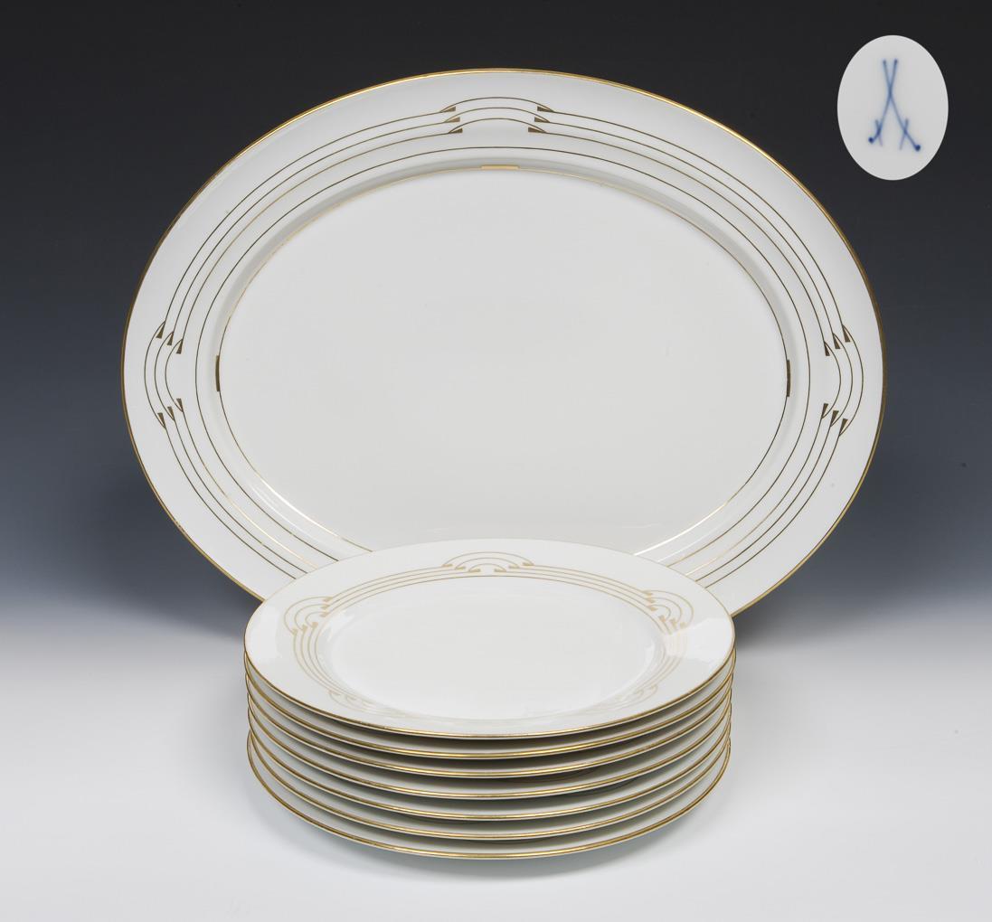Große Jugendstil-Servierplatte, 7 Essteller. Meissen.