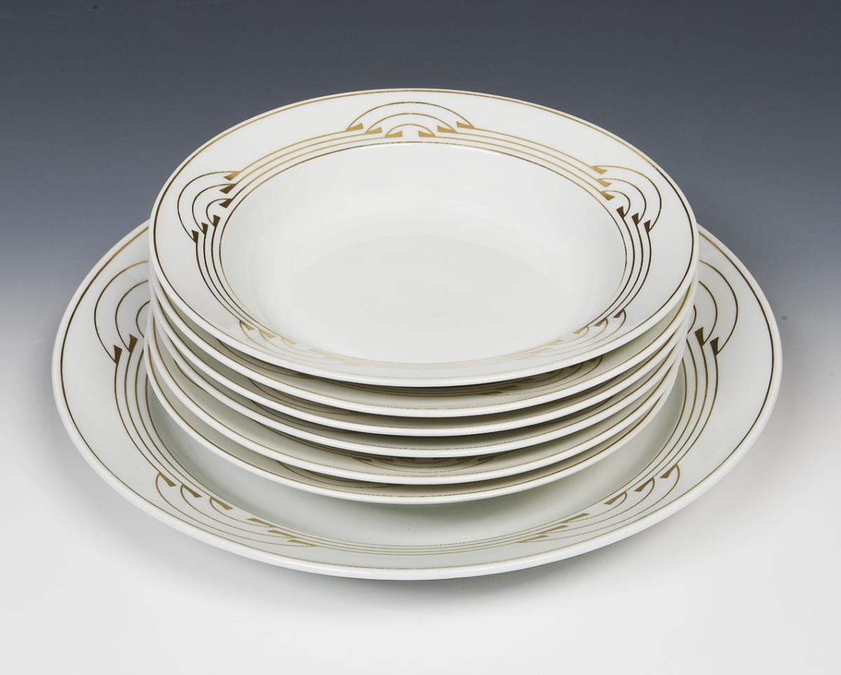 Form-Modell von 1901, Dekor-Modell von 1907. Geometrische Bemalung in Gold, "Bügelservice", Form "T- galtt". Pressmarken, Schwertermarken.