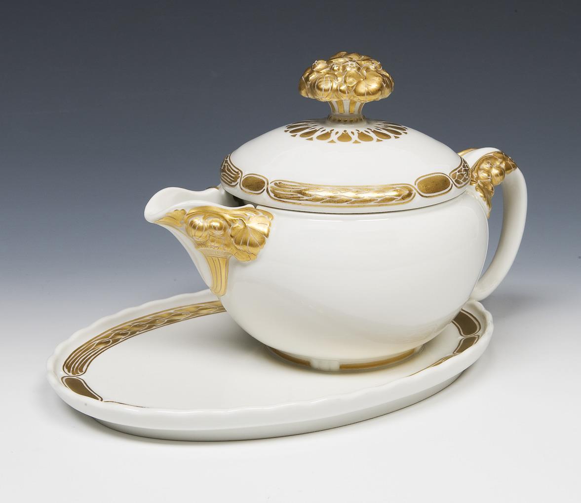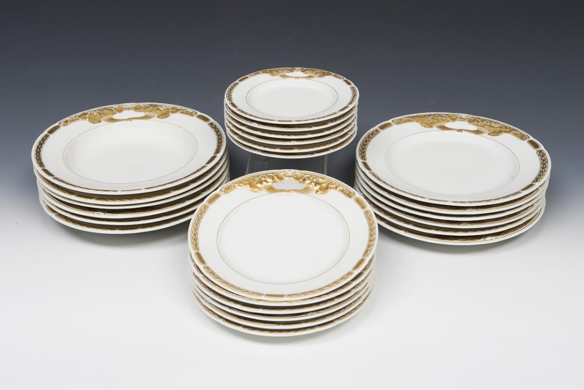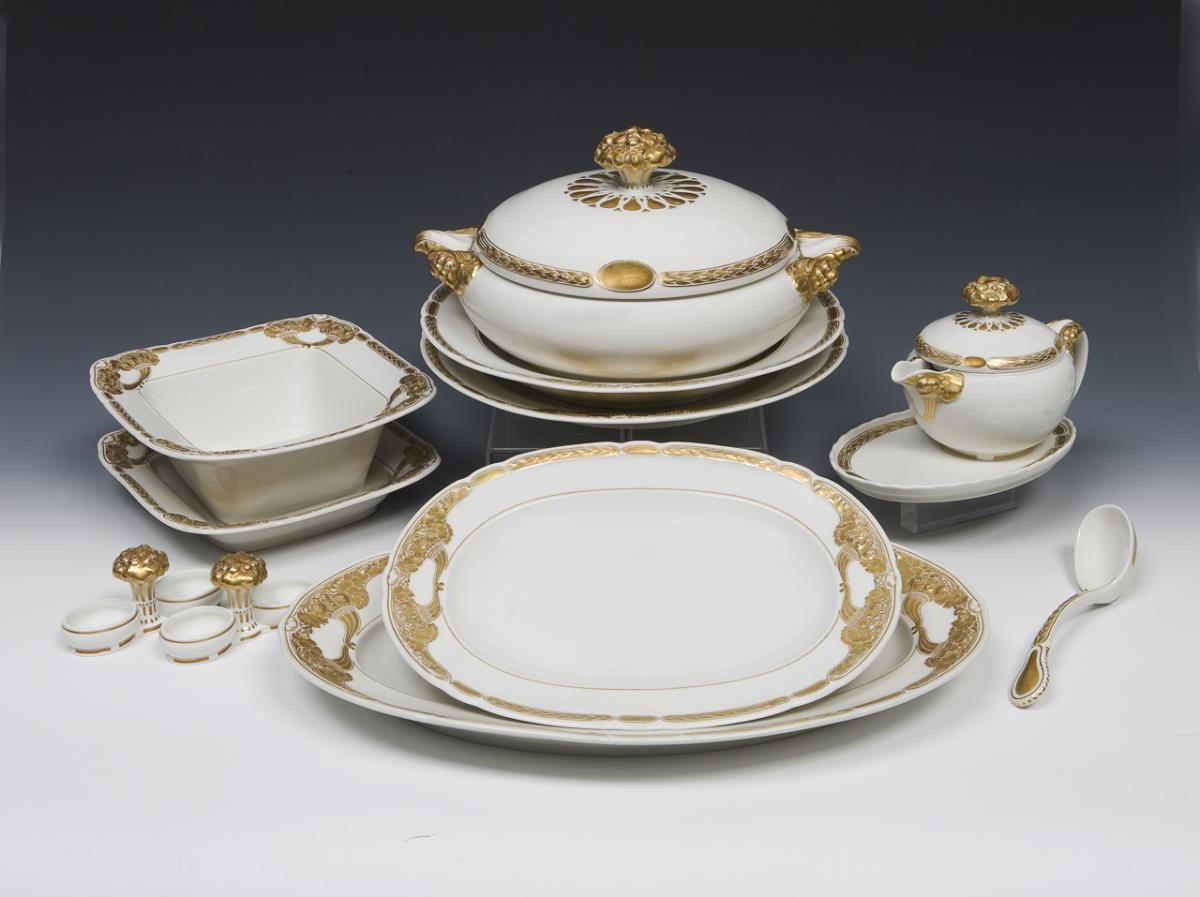 Modell-Jahr: 1912. Das Modell "Ceres" wurde zum 150-jährigen Jubiläum der Manufaktur 1913 geschaffen. 35 Teile: 1 Terrine, 2 große runde Platten, 1 Fischplatte, 1 Speiseplatte, 1 Deckelsauciere, 2 quadratische Schalen, 2 Gewürzgefäße, 1 Servierlöffel, 6 Essteller, 6 Suppenteller, 6 große Dessertteller, 6 kleine Dessertteller. Reliefdekor mit Füllhörnern und Ährenkranz, Bemalung in Gold. Pressmarken, Malermarken, grünes Künstler-Signet, blaue Zeptermarken, rote Reichsapfelmarken, schwarze Kriegsmarken. Ein Standring leicht bestoßen.