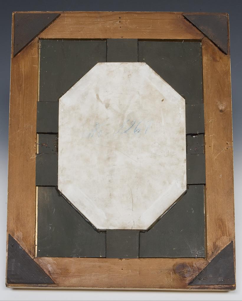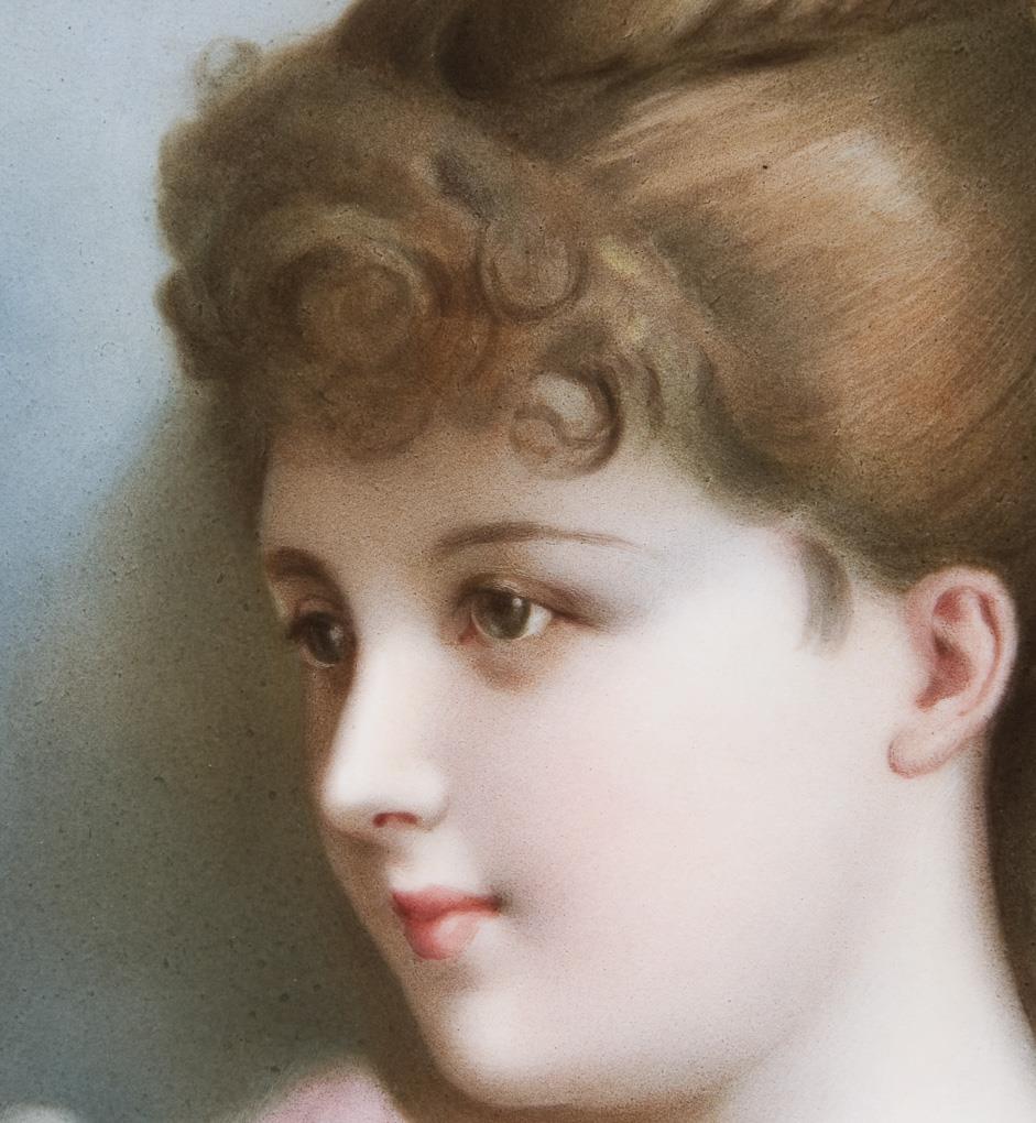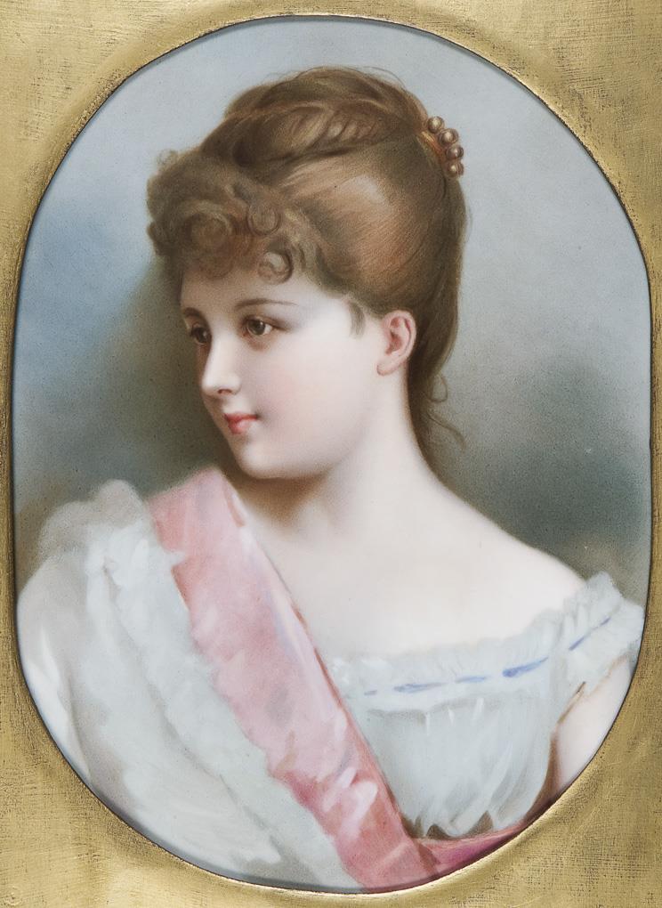 Die anmutige junge hübsche Person präsentiert sich mit leicht lächelnden Gesichtszügen im Dreiviertelprofil. Feine farbige Bemalung in pastellfarbenen Kolorit. Unsigniert, achteckige Form, unglasierter Boden, ohne Marke. Vergoldeter Stuckrahmen mit vergoldetem Holz-Passepartout. Auf dem Holz-Passepartout montiert.
