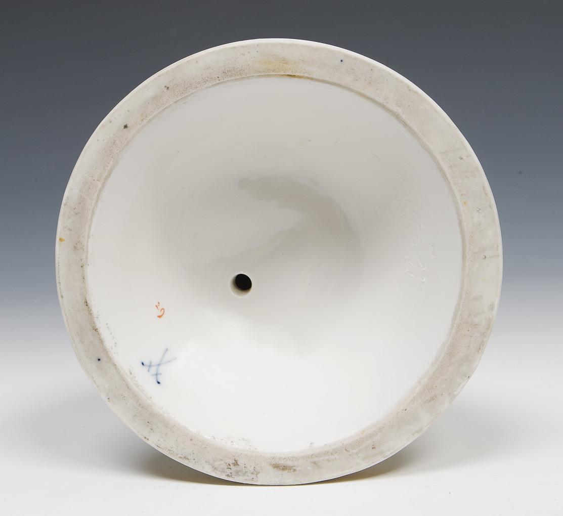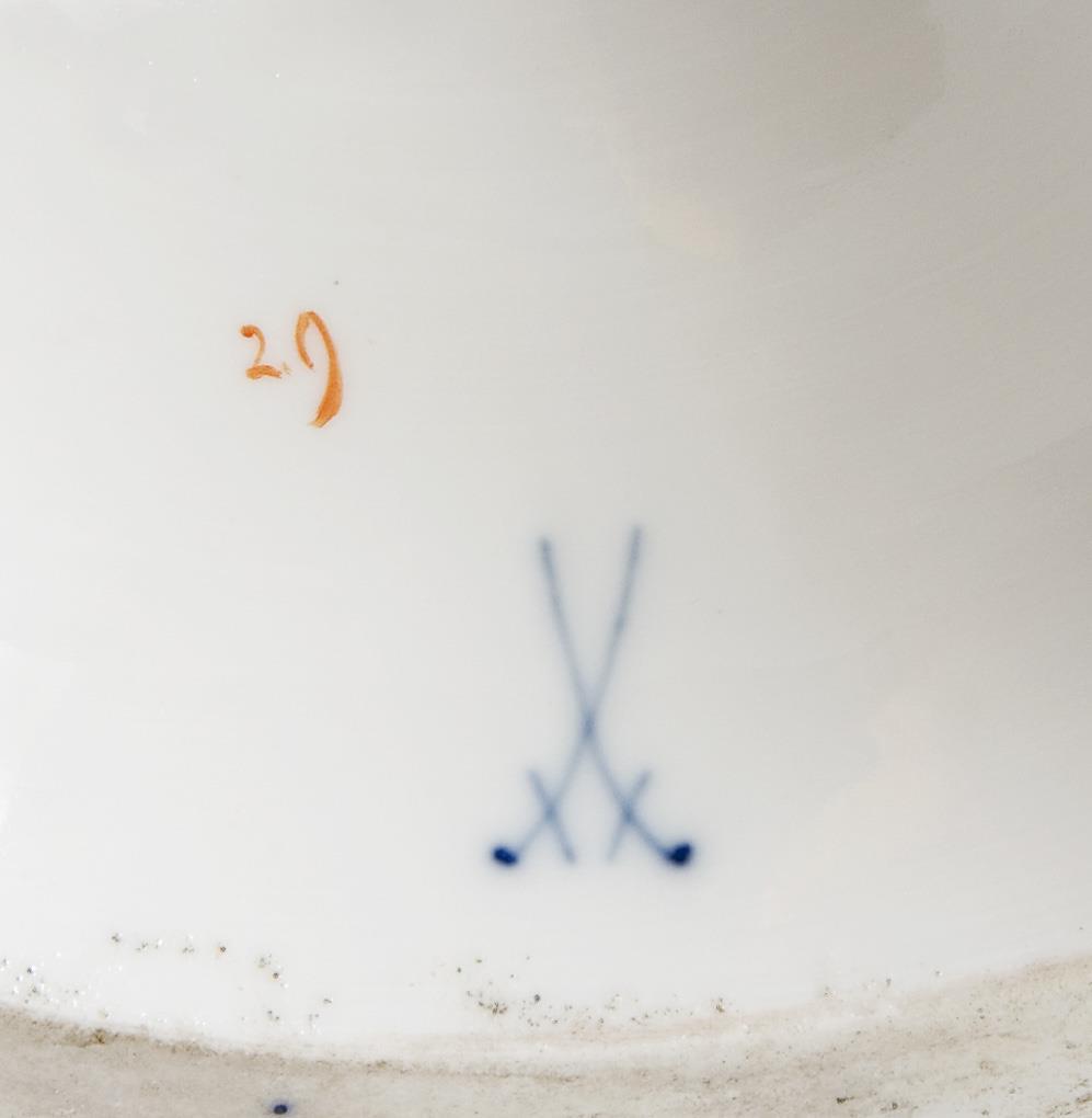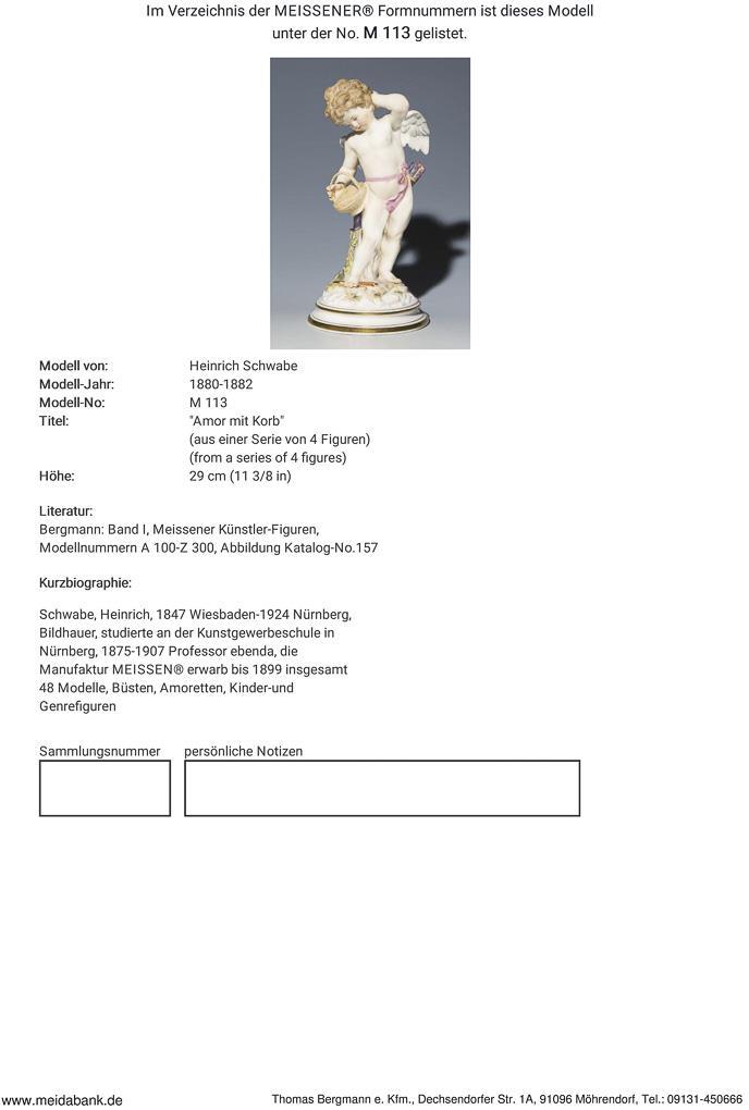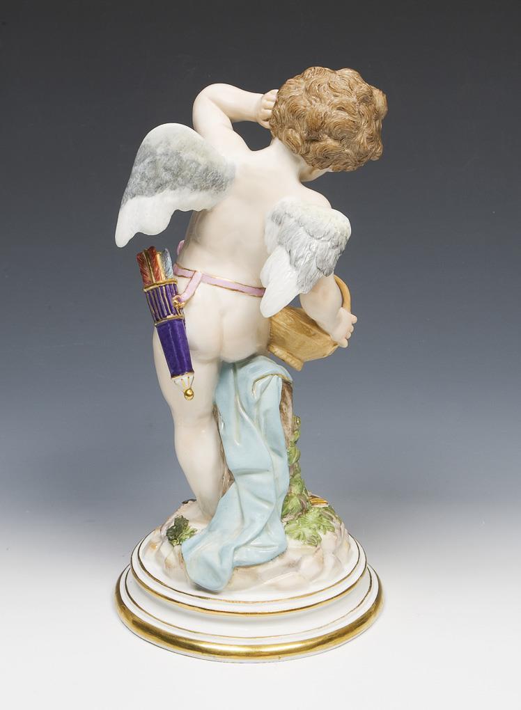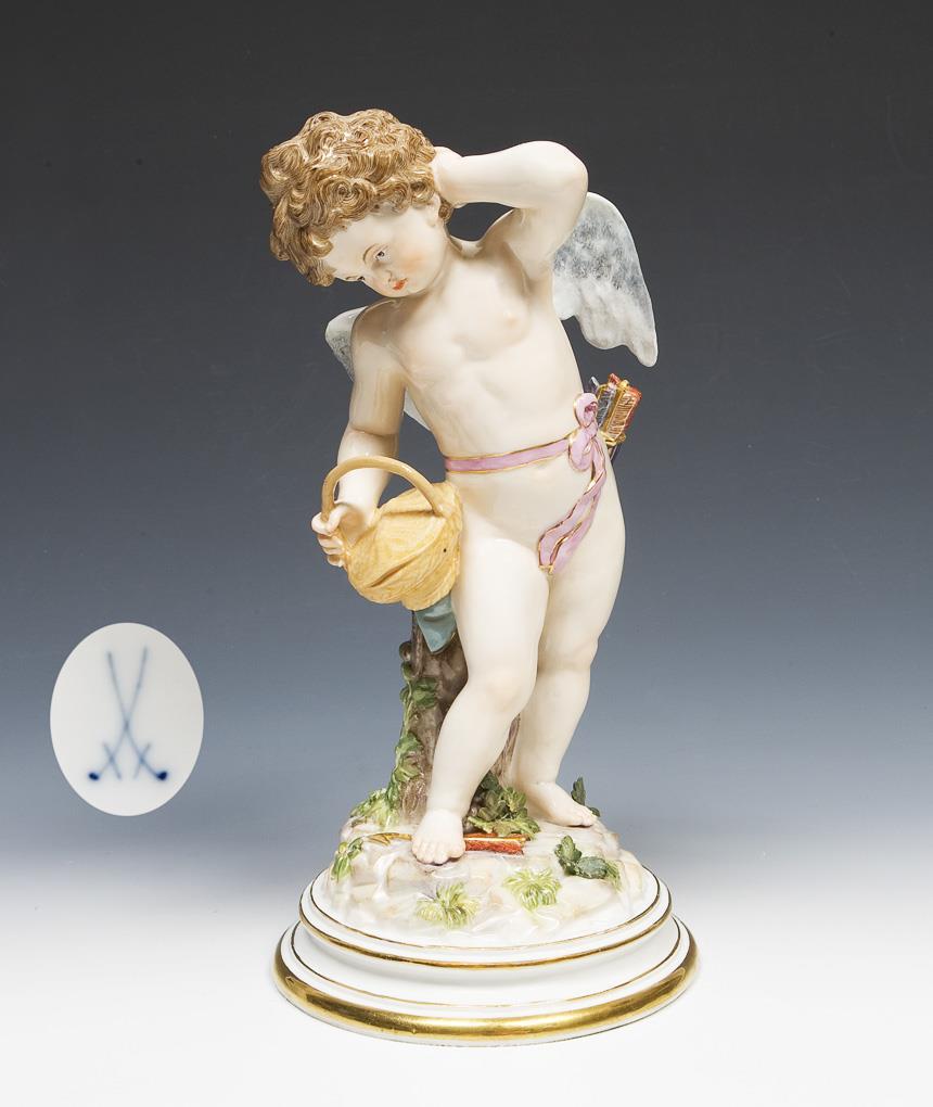Modell-Jahr: 1880-1882. Amor hat sprichwörtlich einen Korb bekommen (sein Liebesantrag wurde abgewiesen). Aus einer Serie von vier Figuren, farbig bemalt, gold staffiert. Ritzmarke, Pressmarke, Malermarke, Schwertermarke. Henkel, ein Flügel, einige Blättchen restauriert, Pfeilspitze minimal bestoßen.