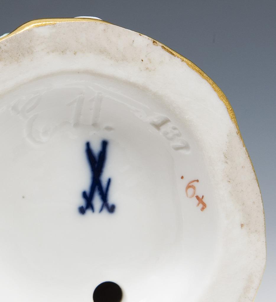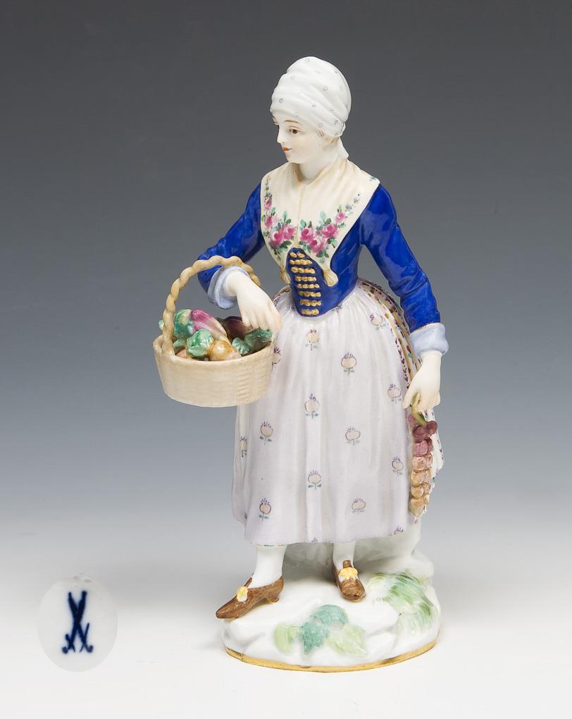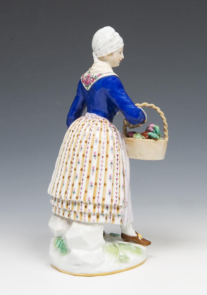 Modell von Johann Joachim Kaendler und Mitarbeiter 1772-1773. Farbig bemalt, gold staffiert. Pendant zu "Dänischer Bauer" (Modell-Nr. E 12). Ritzmarke, Pressmarke, Malermarke, Schwertermarke. Henkel, Gemüse restauriert.