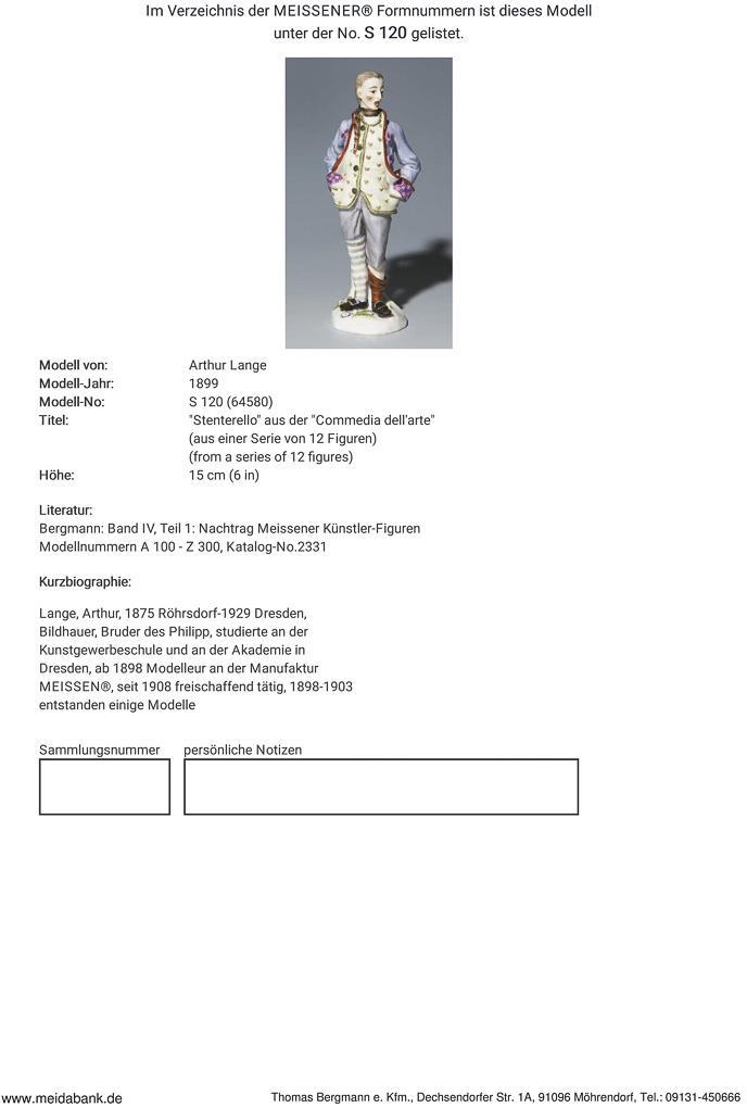 Lange: Bildhauer, Bruder des Philipp, studierte an der Kunstgewerbeschule und an der Akademie in Dresden. Ab 1898 Modelleur in Meissen, seit 1908 freischaffend tätig. Meissen-Manufaktur-Preis: 2690,- Euro * Partnerauktion Bergmann.