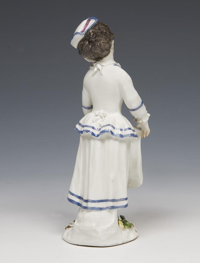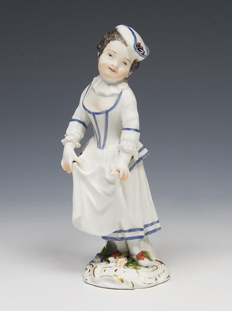 Modell-Jahr: 1755-1765. Farbig bemalt, gold staffiert. Pendant zu "Komödiantenkind als Diener" (Modell-Nr. 6 a), aus einer Serie von 24 Figuren. Unglasierter Boden mit ehemals verwaschener Schwertermarke, Pressmarke. Hutschleife, eine Schuhspitze minimal bestoßen, kleiner Brandriss auf der Stirn.
