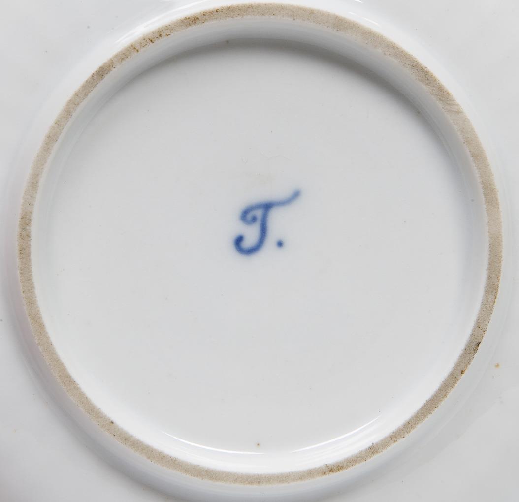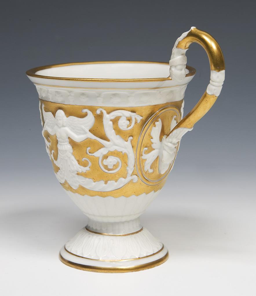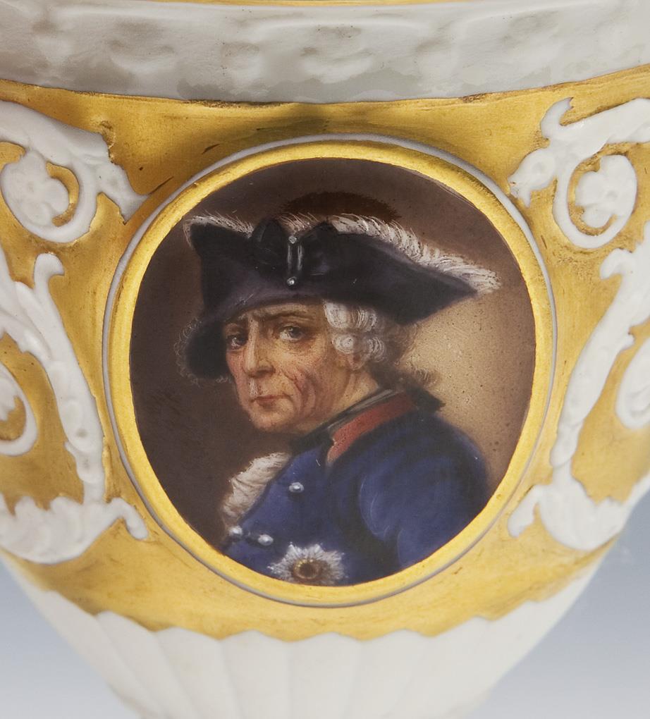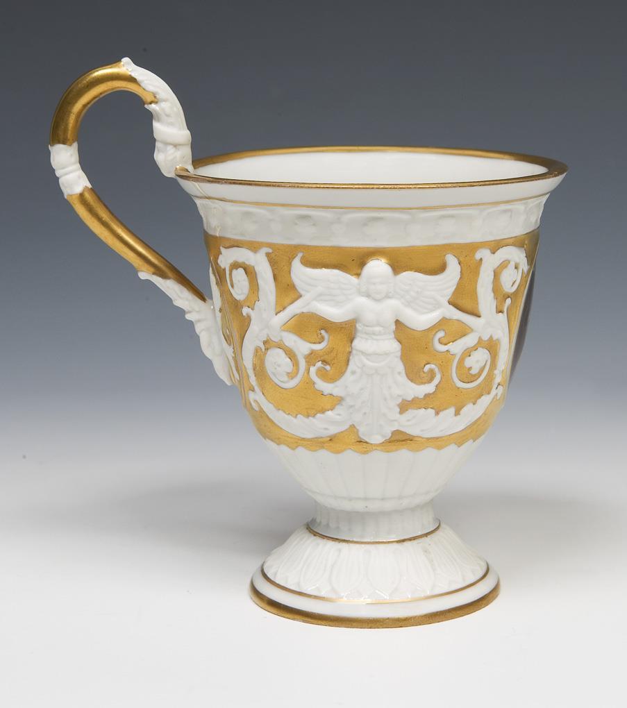 Frontal sehr fein gemaltes farbiges Porträt-Medaillon. Partiell ornamental reliefiertes Biskuitporzellan, auf der Tassenwandung über Goldfond, im Spiegel Goldrosette, Goldstaffage. Unterglasurblaue T-Marke.