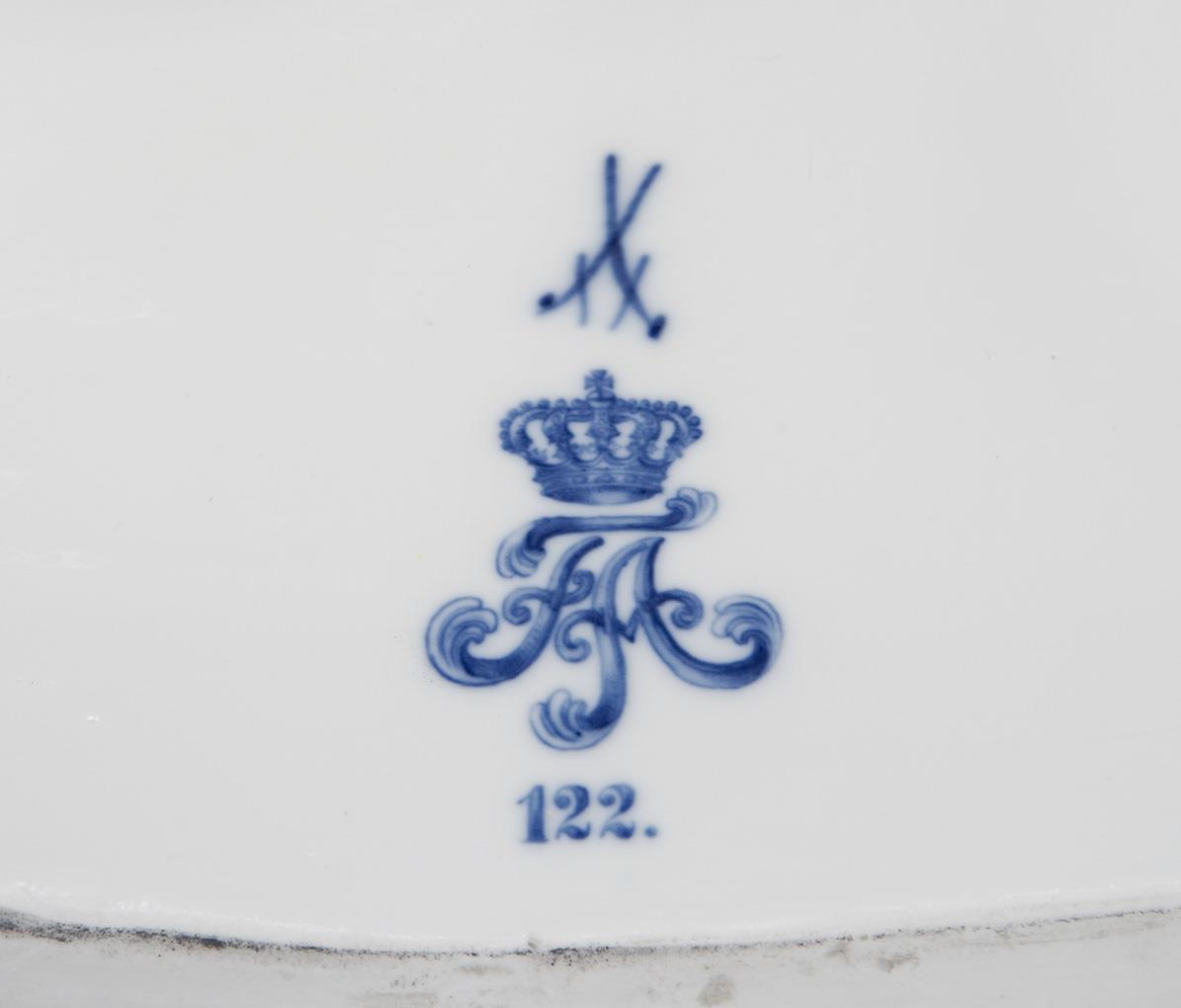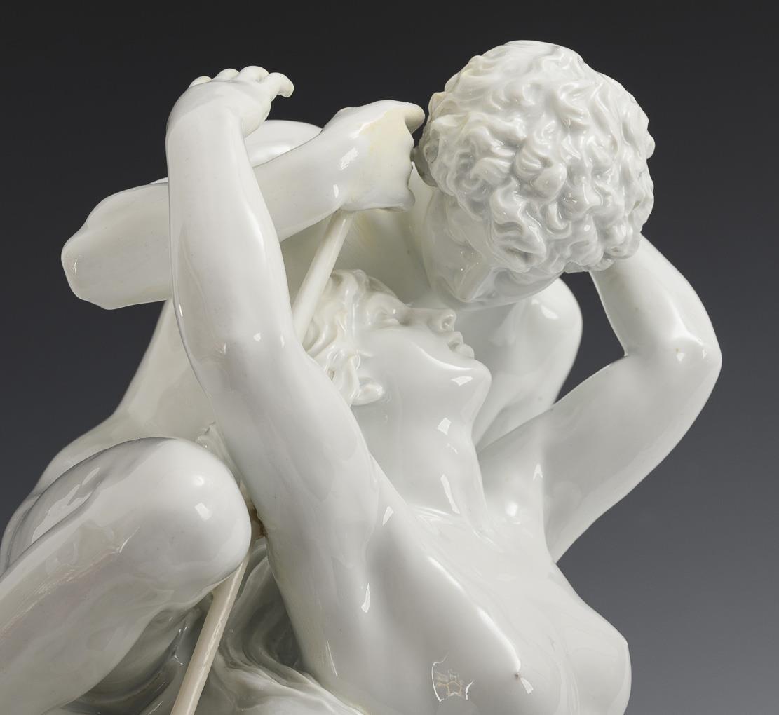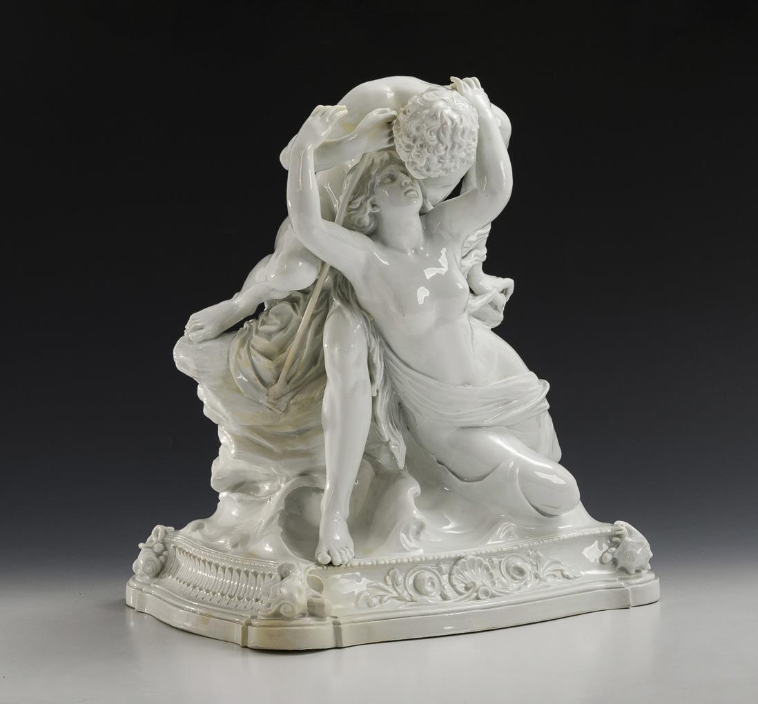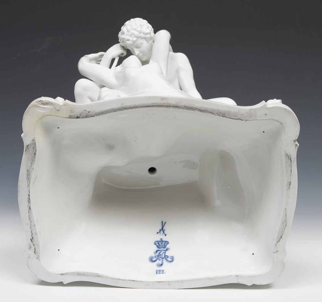 Modell-Jahr: 1886. Weißporzellan. Ritzmarke, Pressmarke, Schwertermarke, bekröntes unterglasurblaues Monogramm FA mit (Inventar-Nr.) 122 von König Friedrich August III. Die Gruppe in Carrara-Marmor in Lebensgröße steht in Hamburg, Stiftung Historische Museen, Jenisch Haus. Ursprünglich für das Schloss der Hamburger Kaufmann-und Bankier-Familie Donner in Auftrag gegeben, kam sie als Geschenk des Freiherrn Conrad Hinrich von Donner in das Museum. Eine Sockelecke, der untere Stab (sichtbar), zwei kleine Sockelkanten, zwei Zehen partiell restauriert, die restaurierte Sockelecke von unten, eine Tuchkante (minimal) bestoßen, Stababschluss fehlt, partiell kleine Glasurdefekte, Brandrisse. Oberes Stabende und Finger der rechten Hand des Fischers mit alten Sprühresten, die man abkratzen kann.