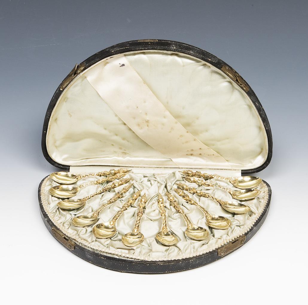 12er Satz Historismus-Mokkalöffel im Original-Etui.