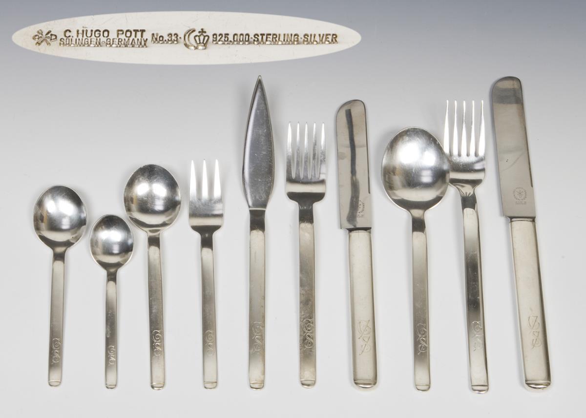 Modell von Carl Pott 1975, Modell-Nr. 33. 133 Teile: 12 Messer, 12 Gabeln, 12 Menuemesser, 12 Menuegabeln, 12 Menuelöffel, 12 Kuchengabeln, 12 Dessertlöffel, 8 Mokkalöffel, 10 Kaffeelöffel, 8 Fischmesser, 8 Serviettenringe, 1 Fisch-Serviermesser, 1 Fisch-Serviergabel, 2 Heber, 1 Soßenkelle, 4er Satz Servierlöffel, 2 kleine Serviergabeln, 1 große Serviergabel, 2 Buttermesser, 1 Käsemesser. Design-Klassiker, die fünf Zinken der Gabeln waren ein völliges Novum, ein besonderer Akzent ist die feine Kerbe am Griffende. Massive qualitätvolle Arbeit mit graviertem Monogramm. Messer mit rostfreienn Solingen-Edelstahlklingen. Punzen: Halbmond und Krone, Feingehalt, Fabrikmarke.