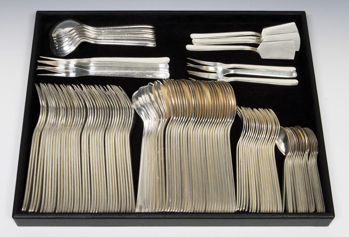 Modell von Carl Pott 1952, das sogenannte "Kanzlerbesteck". Modell-Nr. 84. 334 Teile: 18 Messer, 18 Gabeln, 18 Esslöffel, 38 Menuemesser, 38 Menuegabeln, 34 Menuelöffel, 18 Dessertgabeln, 18 Mokkalöffel, 16 Kaffeelöffel, 12 Hummergabeln, 14 Fischmesser, 14 Fischgabeln, 7 Obstmesser, 7 Obstgabeln, 6 Dessertlöffel, 10 Kuchengabeln, 6 Eislöffel, 6 Gourmet-Soßenlöffel, 1 Suppenkelle, ein 2-teiliges Salatbesteck, 1 Servierlöffel, 2 Spargelheber, 2 Fisch-Serviermesser, 2 Fisch-Serviergabeln, 2 große, 4 mittlere, 3 kleine Serviergabeln, 4 Buttermesser, 3 Soßenkellen, 6 Dessert-Servierlöffel, 2 flache Servierlöffel, 2 gemuldete Servierlöffel. Design-Klassiker, massive qualitätvolle Arbeit. Neben dem Kanzleramt von Ludwig Erhard wurden fast alle deutschen Botschaften mit dem Besteck ausgestattet. Messer mit rostfreien Solingen-Edelstahlklingen. Punzen: Halbmond und Krone, Feingehalt, Fabrikmarke.
