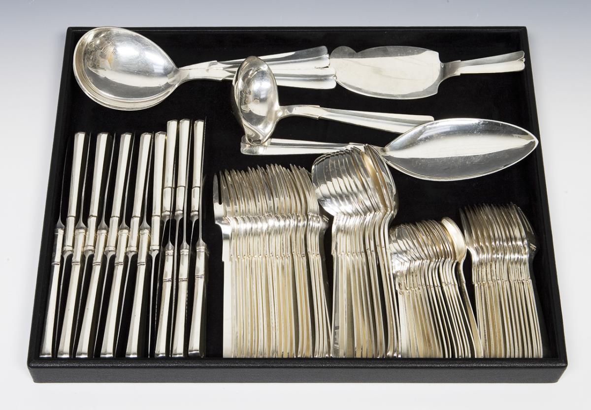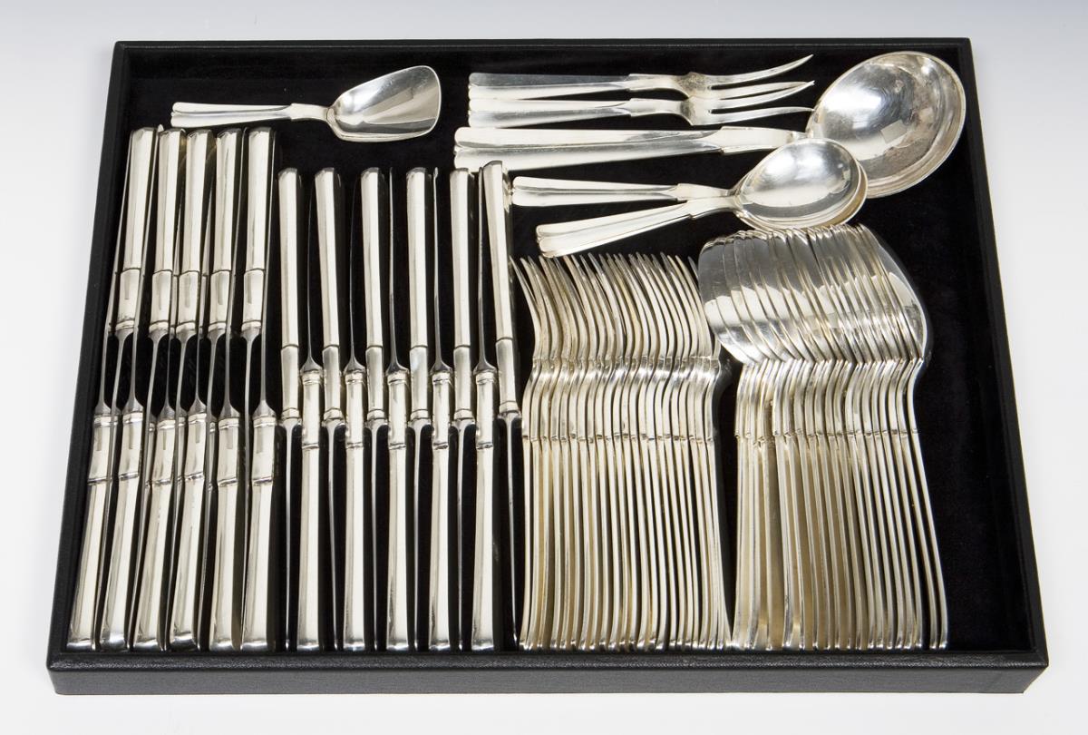 Modell von H. F. Gross 1930. Modell "Erbsilber" Serie Nr. 7. 152 Teile: 11 größere, 11 kleinere Messer, 22 Gabeln, 18 Esslöffel, 10 größere, 6 kleinere Menuemesser, 18 Menuegabeln, 12 Menuelöffel, 14 Kuchengabeln, 18 Kaffeelöffel, 1 Soßenkelle, 2 verschiedene Heber, 7 verschiedene Servierlöffel, 2 Serviergabeln. Qualitätvolle Arbeit, Messer mit rostfreien Stahlklingen. Punzen: Feingehalt, Fabrikmarke, teils Stadtmarken von 1930 und 1940, Beschaumeister.