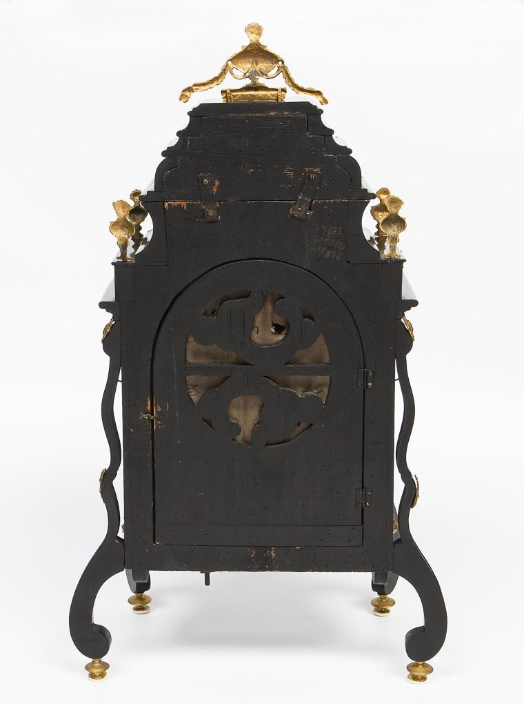 Geschwärztes, allseits geschweiftes, 3-Seiten verglastes Holzgehäuse mit figürlichen, floralen und ornamentalen Applikationen in der Art von Leopold Hoys (1713 Wien - 1797 Bamberg, 1741 Uhrmachermeister). Zifferblatt mit Abstellvorrichtung für ehemaliges Schlagwerk und Repetition, mittig gravierter Totenkopf "UNA EX HIS", Pendelsichtfenster, römische Stundenkartuschen, Ziffernring mit arabischer Minutenanzeige. Schlagwerk auf Tonfeder mit Pendel an Federaufhängung im 19. Jahrhundert ergänzt. Mit Ergänzungen restauriert, Frontscheibe fehlt.