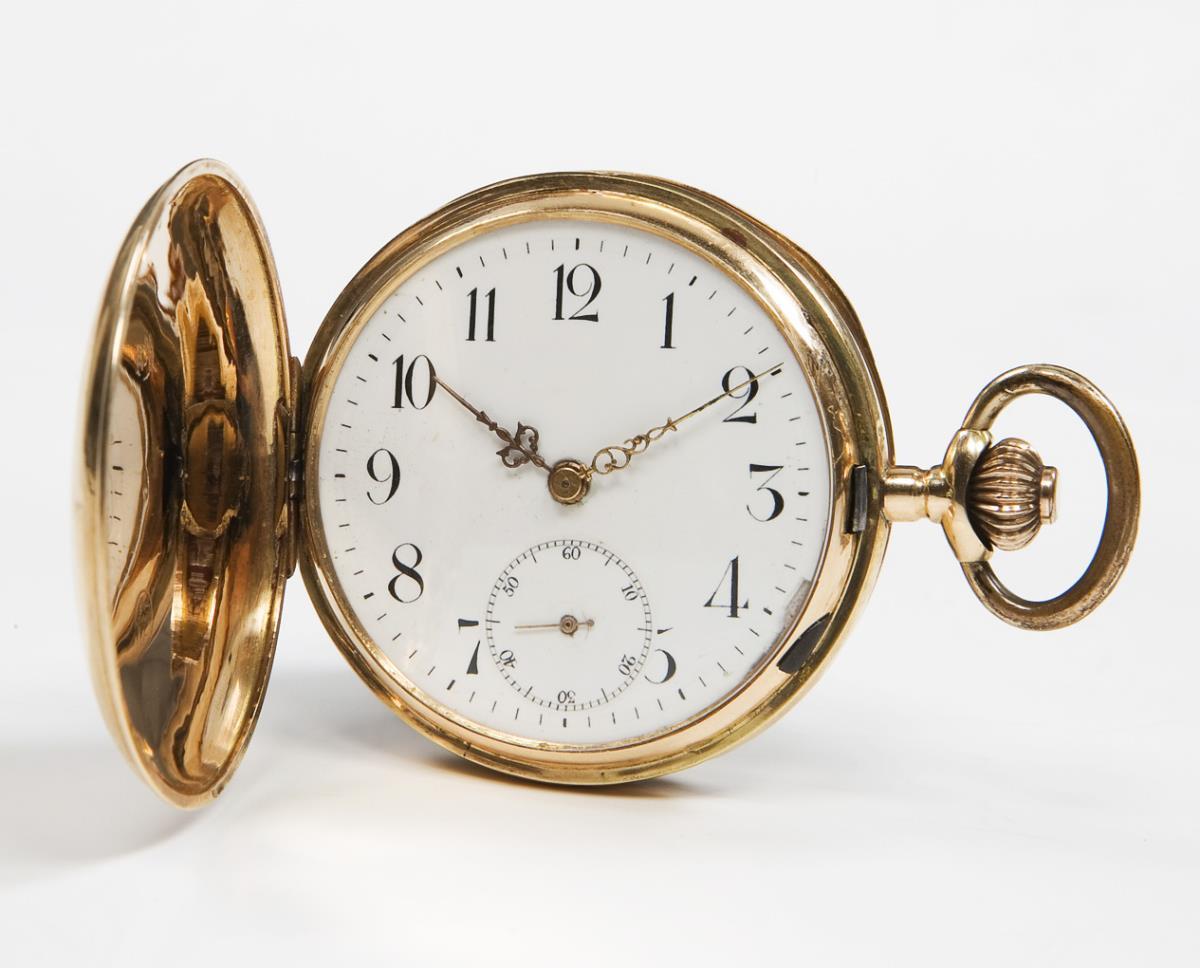 Guillochiertes Gehäuse mit gravierter Kartusche, Metall-Innendeckel. Brücken-Ankerwerk, weißes Emailzifferblatt, schwarze arabische Zahlen, kleine Sekunde, Kronenaufzug. Im Kurzzeit-Test funktionstüchtig. Gehäuse leicht gedellt, Zifferblatt am Rand partiell defekt.