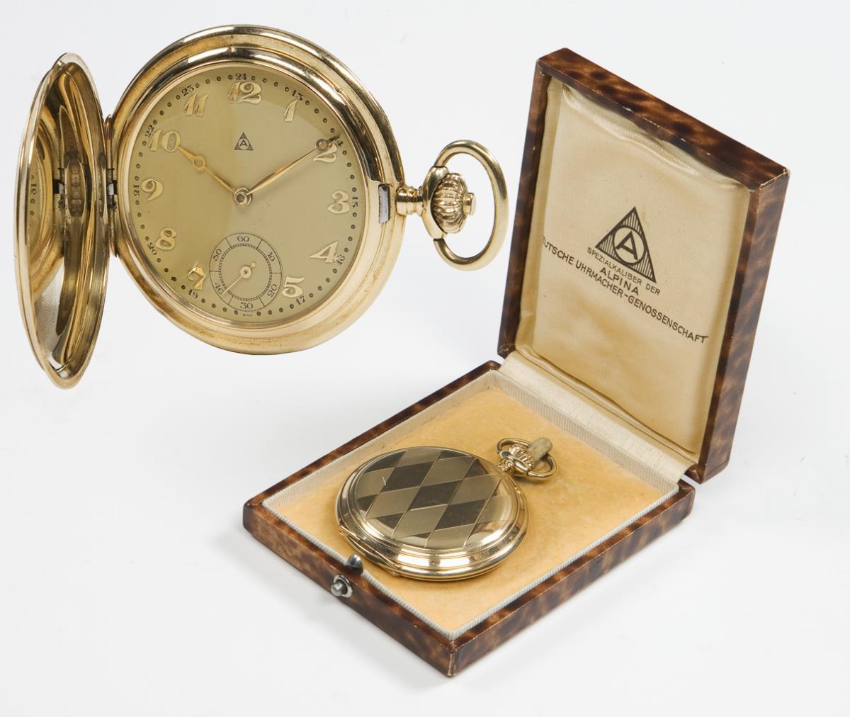 Gold-Savonnette im Original-Etui. Alpina Deutsche Uhrmacher-Genossenschaft.