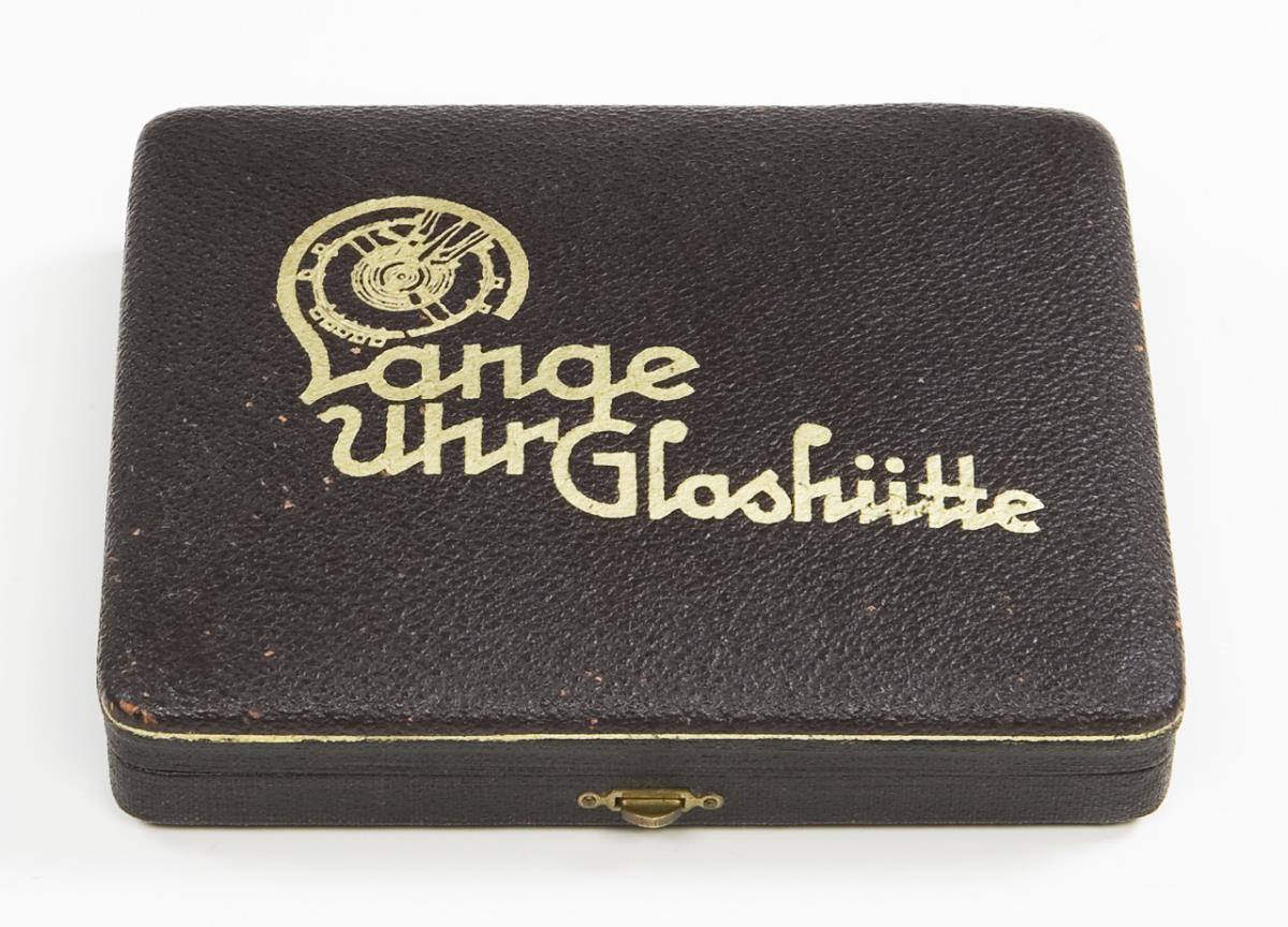 Zifferblatt, Gehäuse, Werk signiert. Frontal graviertes Gehäuse, Gold-Innendeckel. Vergoldetes Dreiviertel-Platinen-Ankerwerk mit gebläuten Stahlschrauben, Kronenaufzug. Weißes Emailzifferblatt, schwarze und rote arabische Zahlen, durchbrochen gearbeitete Zeiger, kleine Sekunde. Im Deckel graviertes Datum: Fratri (lateinisch Bruder) 6. Nov. 1894. Etui: "Lange-Uhr-Glashütte", "Lange-Glashütte, ausgezeichnet mit 41 ersten Preisen". Rückseitig leichte Dellen, nicht funktionstüchtig, Unruhewelle nicht gebrochen, aber verharzt. Service nötig.
