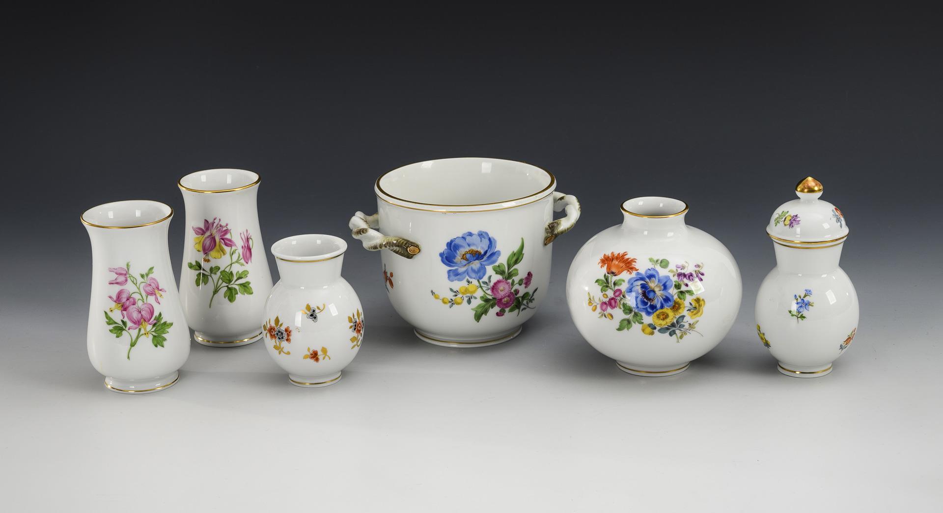 Cachepot und 5 Vase mit Blumenmalerei. Meissen.