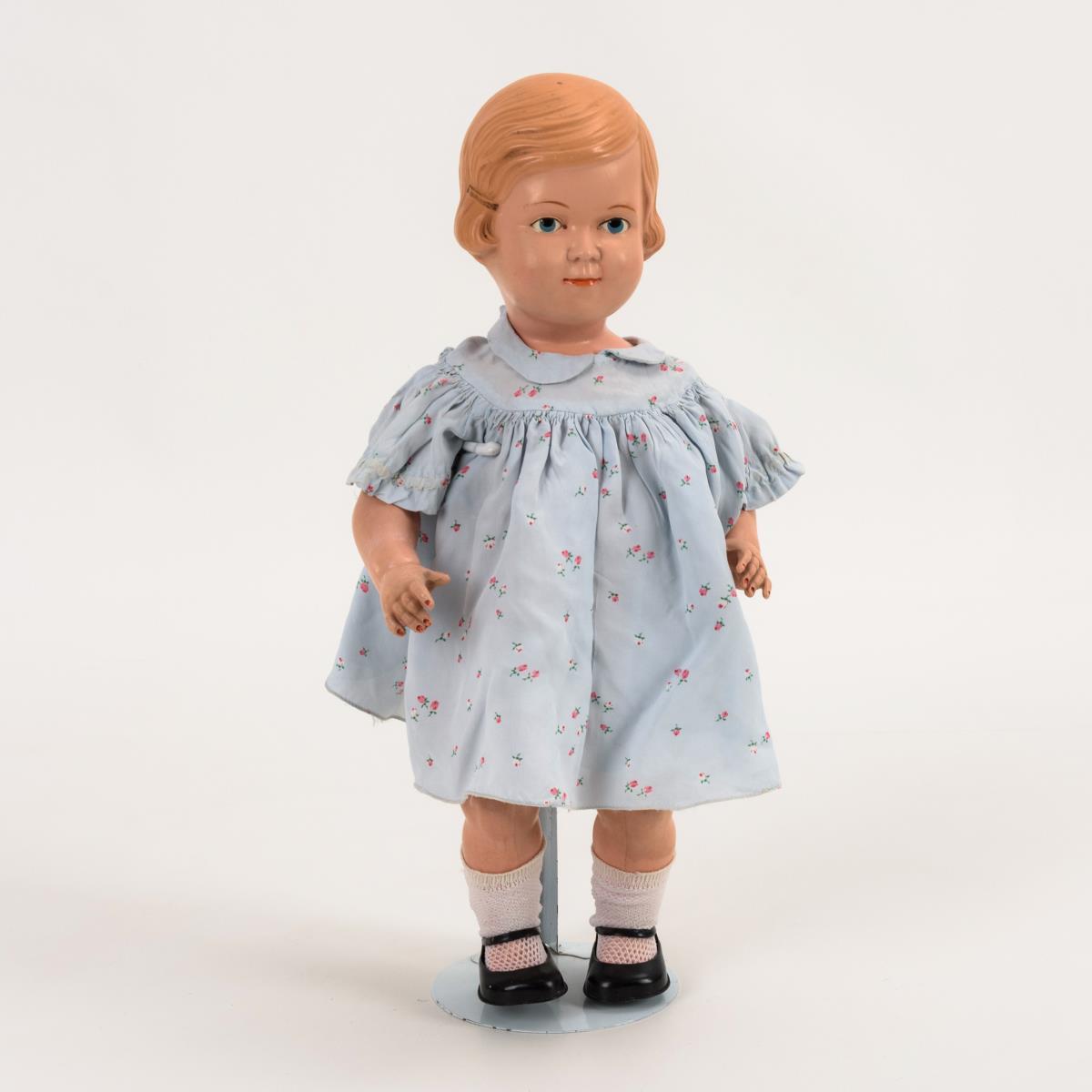 Fester Kopf mit gemalten blauen Augen, modellierter Haarspange, 5-teiligem Stehpuppenkörper und hellblauem Kleidchen. Rechter Fuß provisorisch repariert.
