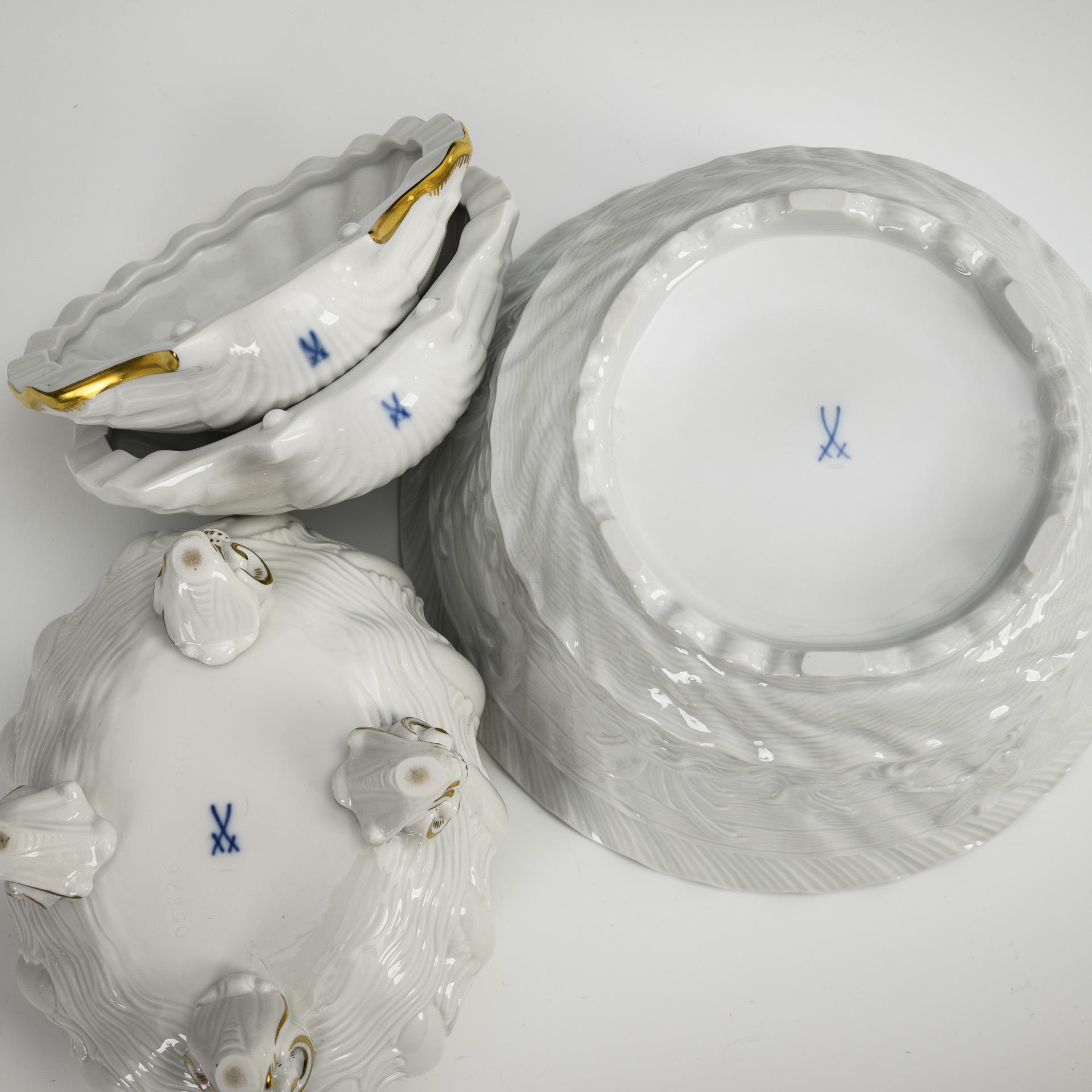 2x weiß: Kumme (H 8 cm, Ø 19 cm) und Muscheldose (Ø 12 cm). / 1x weiß mit Goldstaffage: ovale Dose mit vier Füßen und Deckel mit Asthenkel (H 13,5 cm, L 14 cm). / 1x weiß mit polychromer Kakiemonmalerei und Goldstaffage, Jahresedition 2003/2004: Muscheldose (Ø 12 cm).