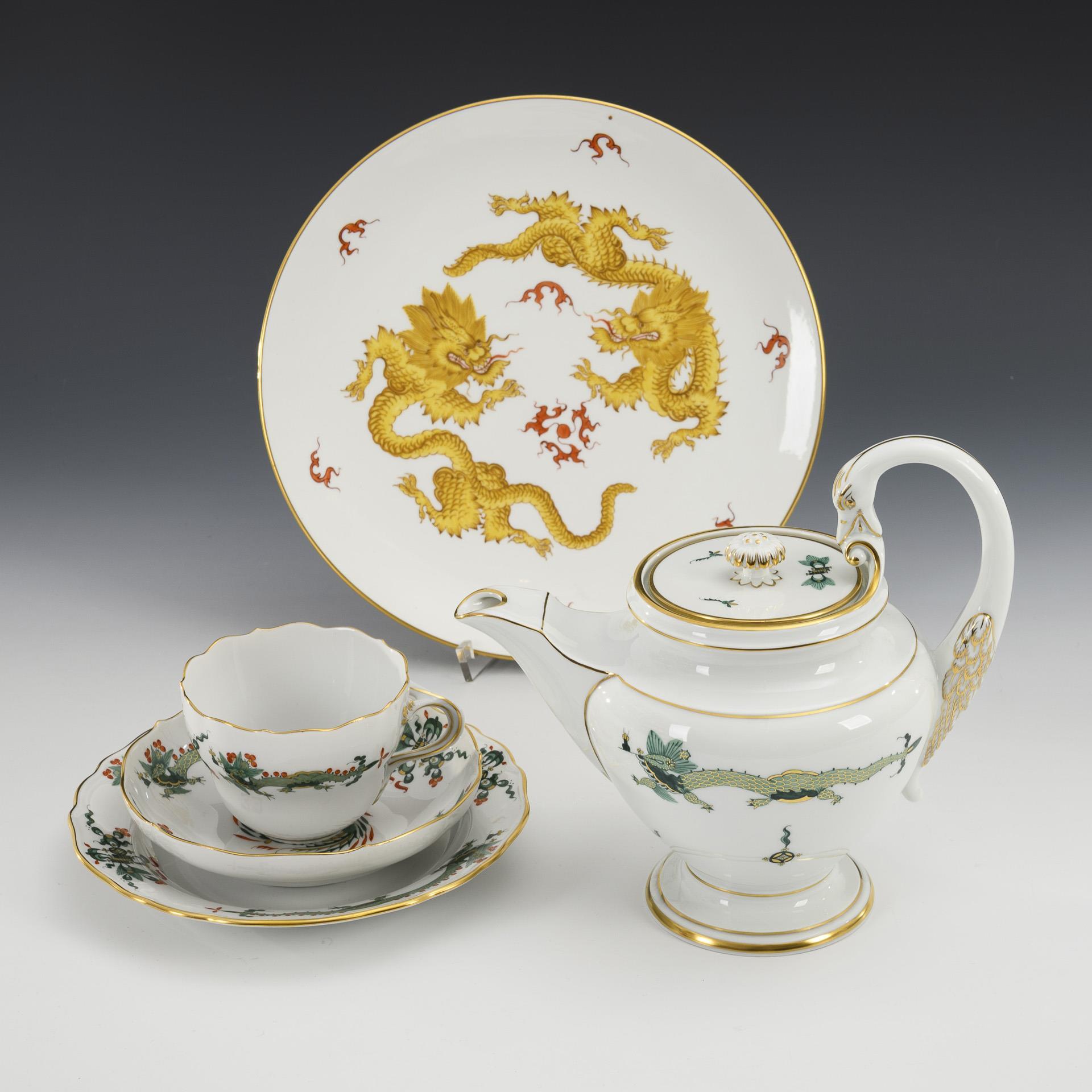 Kanne, Gedeck und Wandteller "Reicher Drache". Meissen.