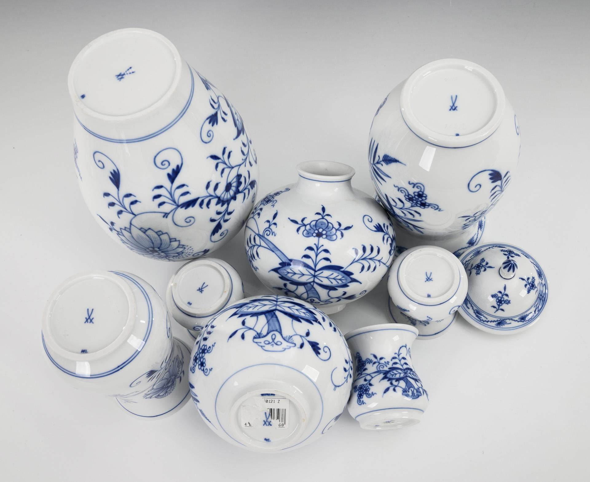 Unterglasurblaue Malerei. Deckelvase (H 26 cm), 1 Balustervase (H 16,5 cm), 1 kleinere Balustervase (H 15 cm), 3 kleine Balustervasen (H 6,4 cm), 2 Kugelvasen (H 11,5 cm). 2,4 kg.