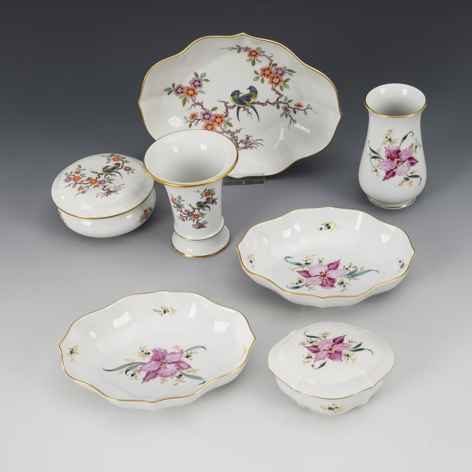 3 Schälchen, 2 Vasen, 2 Dosen mit zweierlei Dekoren. Meissen.