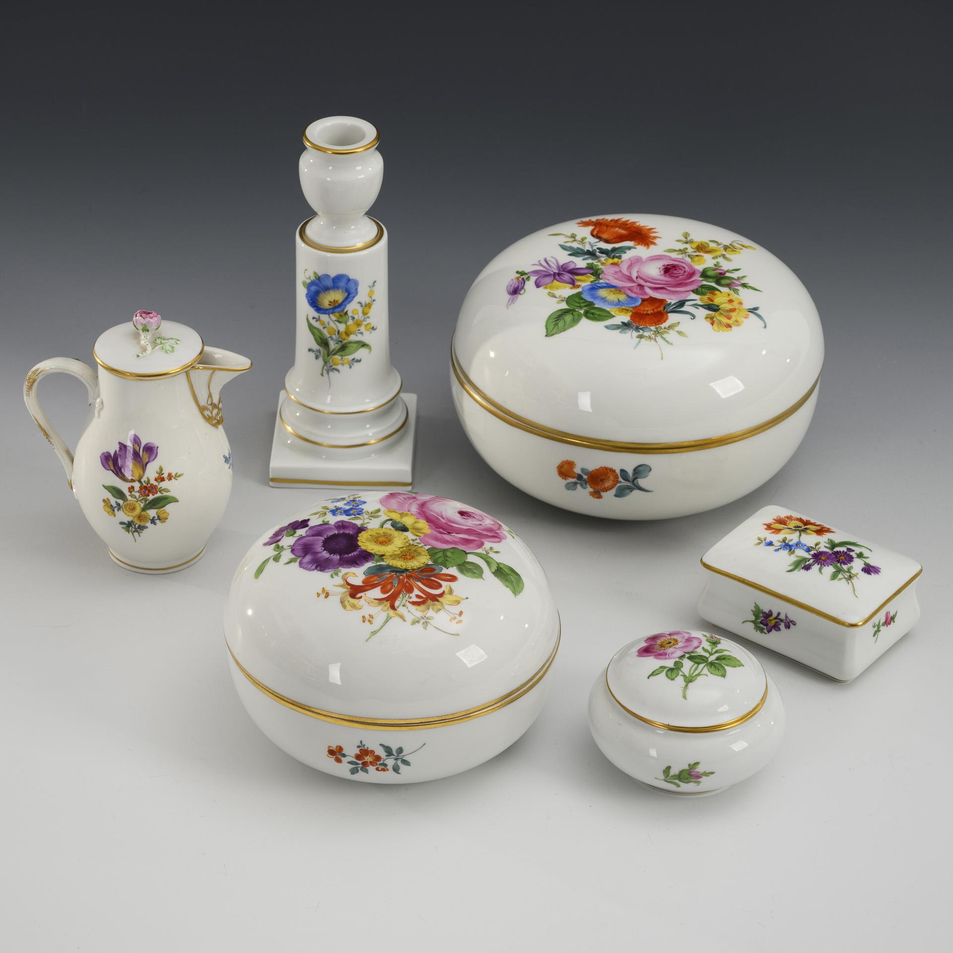 4 Dosen, Kerzenleuchter und Kännchen mit Blumenmalerei. Meissen.