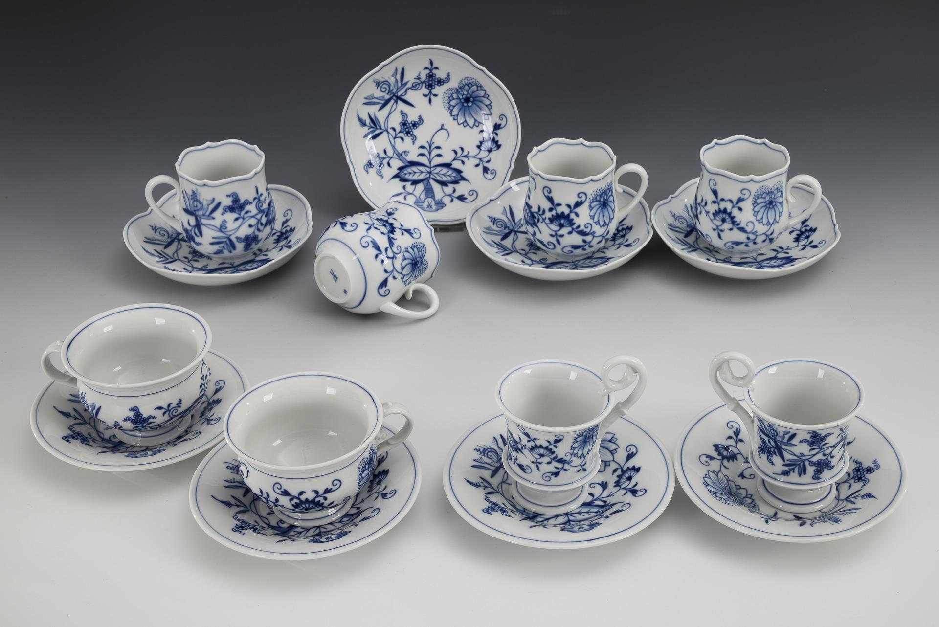 8 verschiedene Zwiebelmuster-Tassen. Meissen.